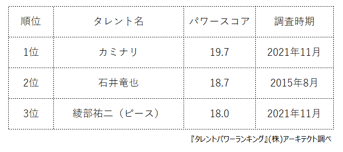 タレントパワーランキングは、株式会社アーキテクトが実施する業界最大規模のタレント(芸能人等有名人)調査結果をもとに、各タレントの有するパワーをリアルタイムにお届けします。