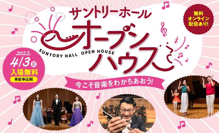 サントリーホール(東京都港区赤坂)は、2022年4月3日(日)11:00~16:15、入場無料(事前申込制)「オープンハウス ~今こそ音楽をわかちあおう!」を開催します。