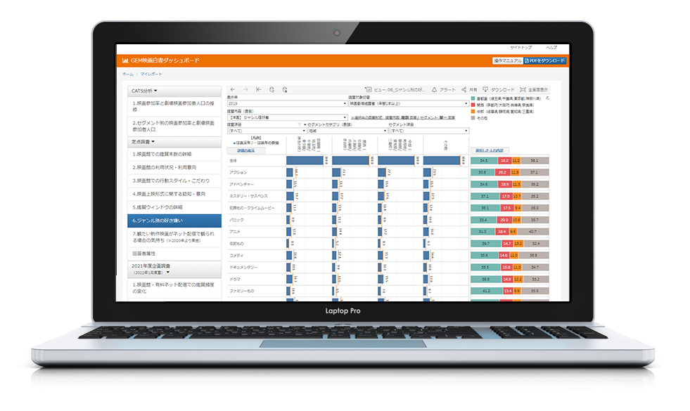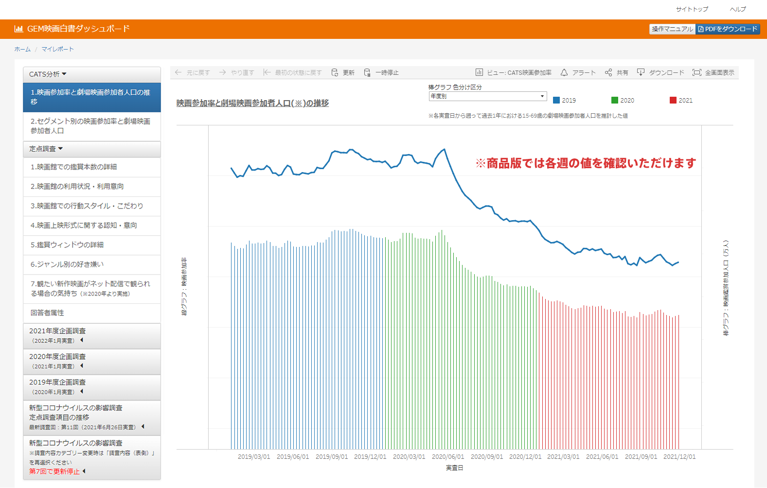 映像コンテンツビジネスの構造・環境が急速に変化するなか、映画鑑賞者の行動心理の「変化」を解き明かすことが求められています。「GEM映画白書ダッシュボード」は、”具体的なデータで映画鑑賞者の実像を浮かび上がらせることができる画期的なオンラインツール“です。今回のアップデートでは、2022年1月に昨年(2021年)を振り返る調査を約1万5,000人に実施し、毎年の「定点調査」はもちろん、映画館と動画配信サービスの鑑賞傾向の違いを明らかにした「企画調査」を行いました。さらに、2021年末より「劇場映画参加者人口」の変化を週次で把握できるようにもなりました。