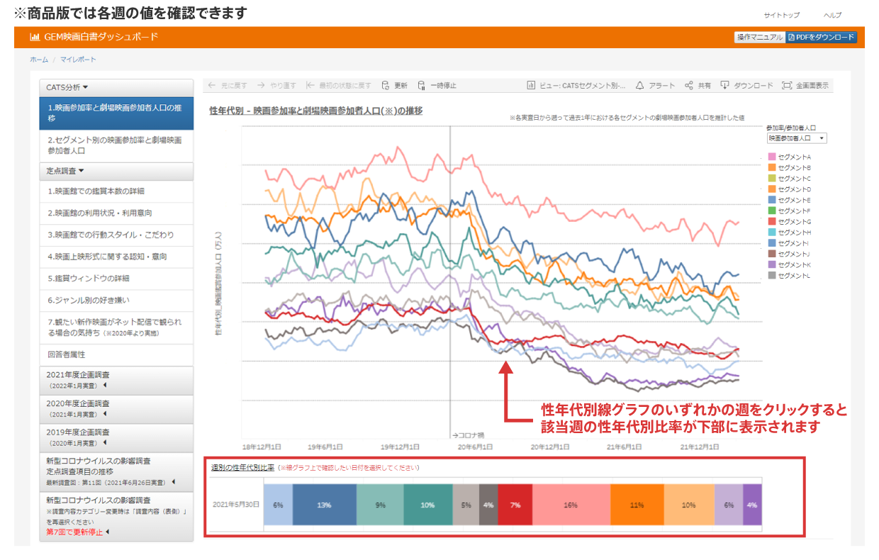昨年末(2021年12月)より、GEM映画白書ダッシュボードで「映画参加率」と「劇場映画参加者人口」の2つのデータを週次で確認できるようになりました。コロナ禍において不透明であった映画館における映画参加者人口の把握はもちろん、性年代別での深掘り分析も可能です。