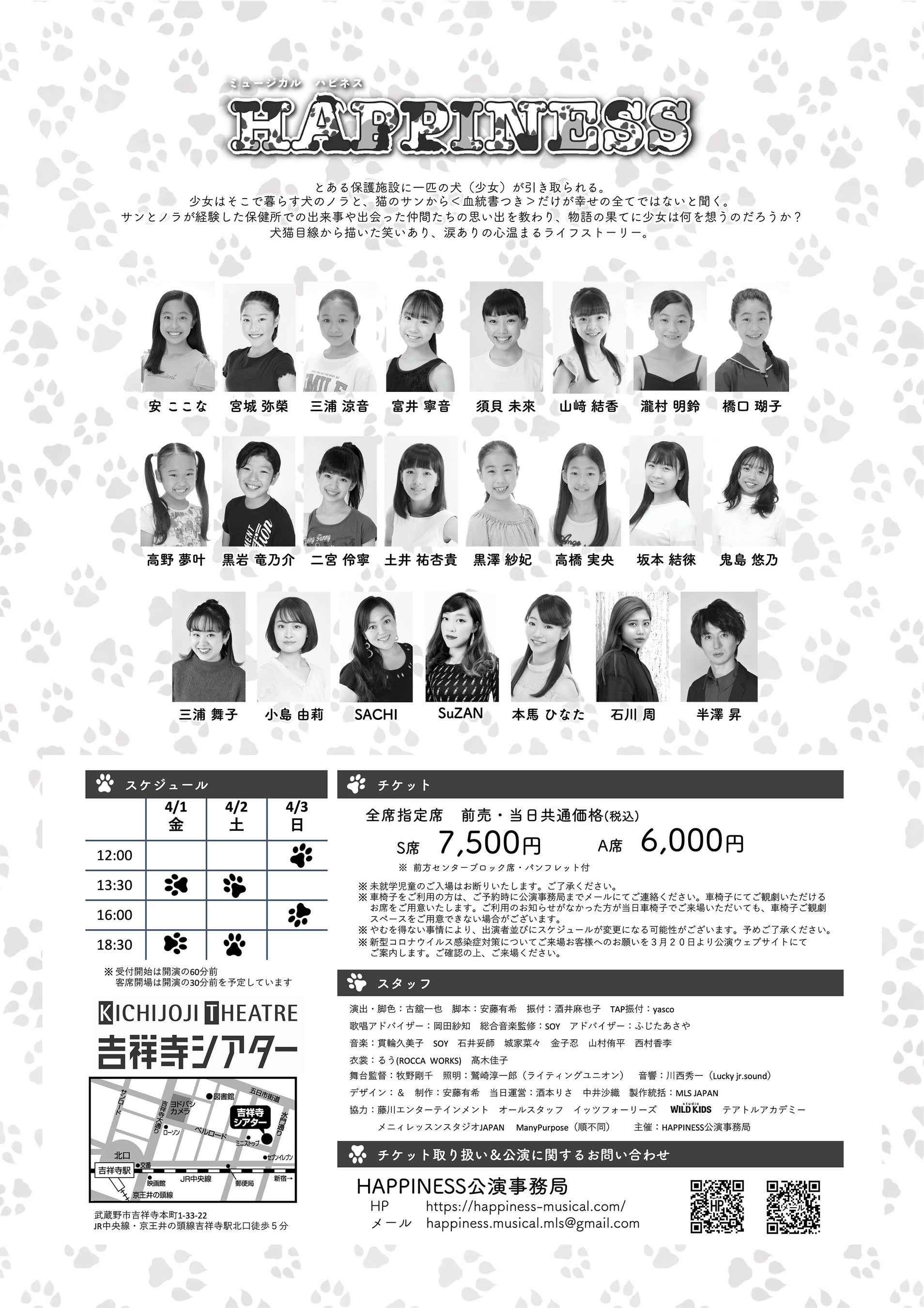 演出・脚色: 古舘一也 / 脚本: 安藤有希 / 振付: 酒井麻也子 / TAP振付: yasco / 歌唱アドバイザー: 岡田紗知 / 総合音楽監修: SOY / アドバイザー: ふじたあさや / 音楽: 貫輪久美子、SOY、石井妥師、城家菜々、金子忍、山村侑平、西村香李 / 衣裳: るう(ROCCA WORKS)、髙木佳子 / 舞台監督: 牧野剛千 / 照明: 鷲崎淳一郎(ライティングユニオン) / 音響: 川西秀一(Lucky jr.sound) / 制作: 安藤有希 / 当日運営: 酒本りさ、中井沙織 / 製作統括: MLS JAPAN / 協力: 藤川エンターテインメント、オールスタッフイッツフォーリーズ、studio WILD KIDS、テアトルアカデミー、メニィレッスンスタジオJAPAN、ManyPurpose(順不動) / 主催: HAPPINESS公演事務局