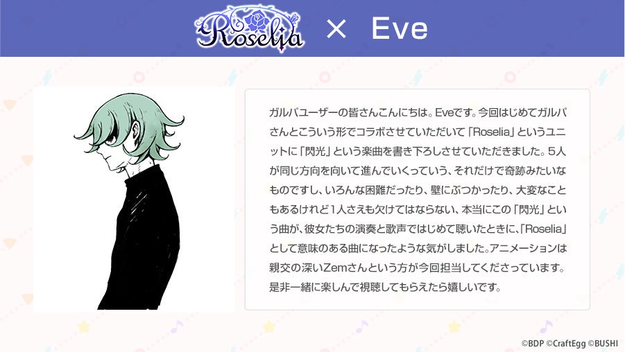 株式会社Craft Egg(本社:東京都渋谷区 代表取締役:森川 修一、以下、Craft Egg)と、株式会社ブシロード(本社:東京都中野区 代表取締役社長:橋本 義賢、以下、ブシロード)の共同制作によるスマートフォン向けゲーム「バンドリ! ガールズバンドパーティ!」(以下、ガルパ)は、2022年3月12日(土)より、アーティストタイアップ第3弾として、「Roselia×Eve」を実施いたしました。