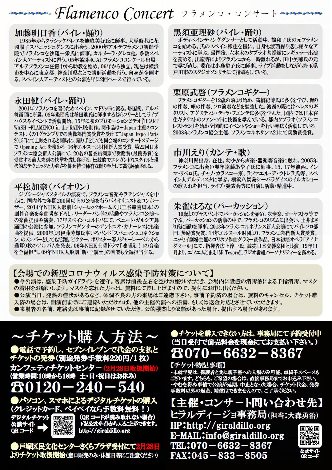 加藤明日香 / 黒須亜理砂 / 永田健(バイレ・踊り) / 栗原武啓(フラメンコギター) / 平松加奈(バイオリン) /朱雀はるな(パーカッション) / 市川えり(カンテ・歌)