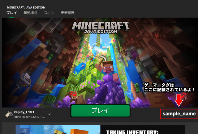 ▼ゲーマータグは、Minecraft Java Editionの起動構成画面からも確認することができます。