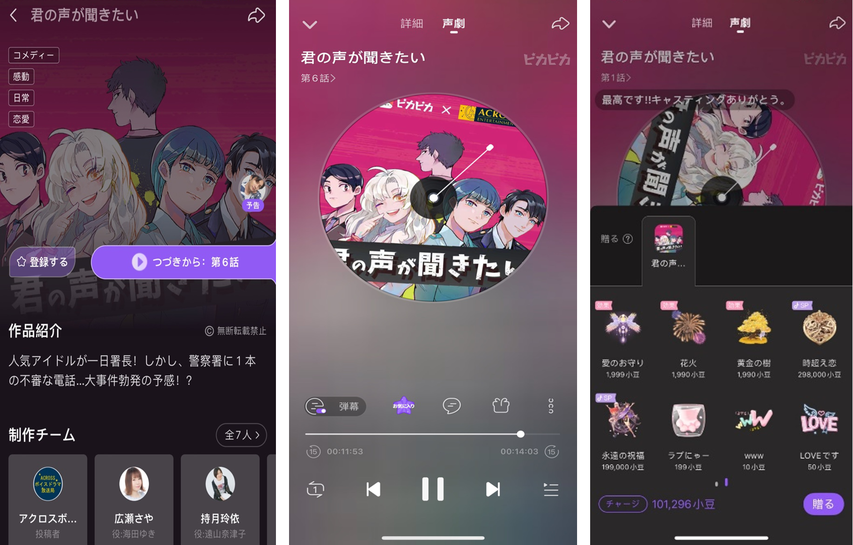 ピカピカの声劇機能では、視覚(ボイスドラマ画像)+聴覚(ハイクオリティ音質)+パーソナライズ(弾幕、コメント、ギフティング、早押し)の融合により、ユーザーは最高の視聴体験をし、自由に想像力を解放することができます。