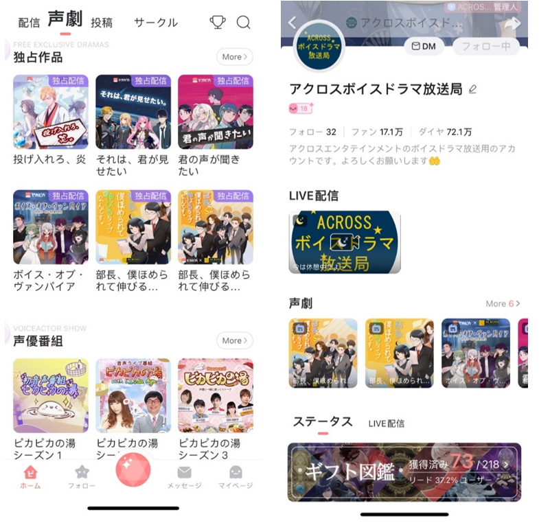 2022年2月よりリリースした新機能「声劇エリア」は、ボイスドラマの制作会社とボイスドラマに興味がある人の間を繋ぐ良いプラットフォームを提供しています。今は某大手声優事務所とのコラボ声劇作品を中心に、恋愛、ファンタジー、コメディー等様々な作品が掲載されています。