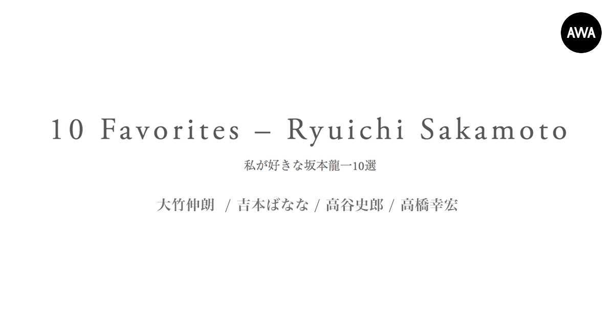 AWA株式会社(本社:東京都港区、代表取締役CEO:冨樫晃己)が運営する、サブスクリプション型(定額制)音楽ストリーミングサービス「AWA(アワ)」は、坂本龍一の楽曲の中から、大竹伸朗、吉本ばなな、高谷史郎、高橋幸宏が選んだ「私が好きな坂本龍一10選」を収録したプレイリストを独占公開いたしました。