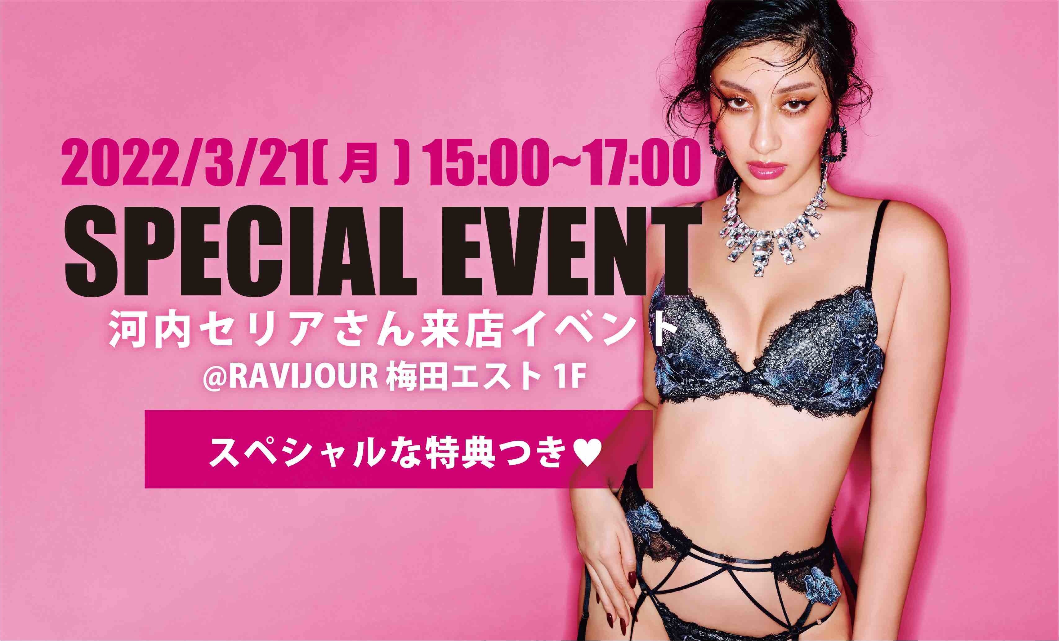 「セクシーに生きる Just be yourself」をステートメントに、女性の新しいセクシーさを追求し、ワンランク上のスペシャルなアイテムを提案するランジェリーブランドRAVIJOUR (ラヴィジュール。会社名:株式会社RAVIJOUR、代表取締役:服部 稔、所在地:東京都目黒区) は、3/21(月) RAVIJOUR梅田ESTにて、モデルとして活躍する河内セリアさんの来店イベント第2弾を開催。スペシャルな特典をご用意いたします。