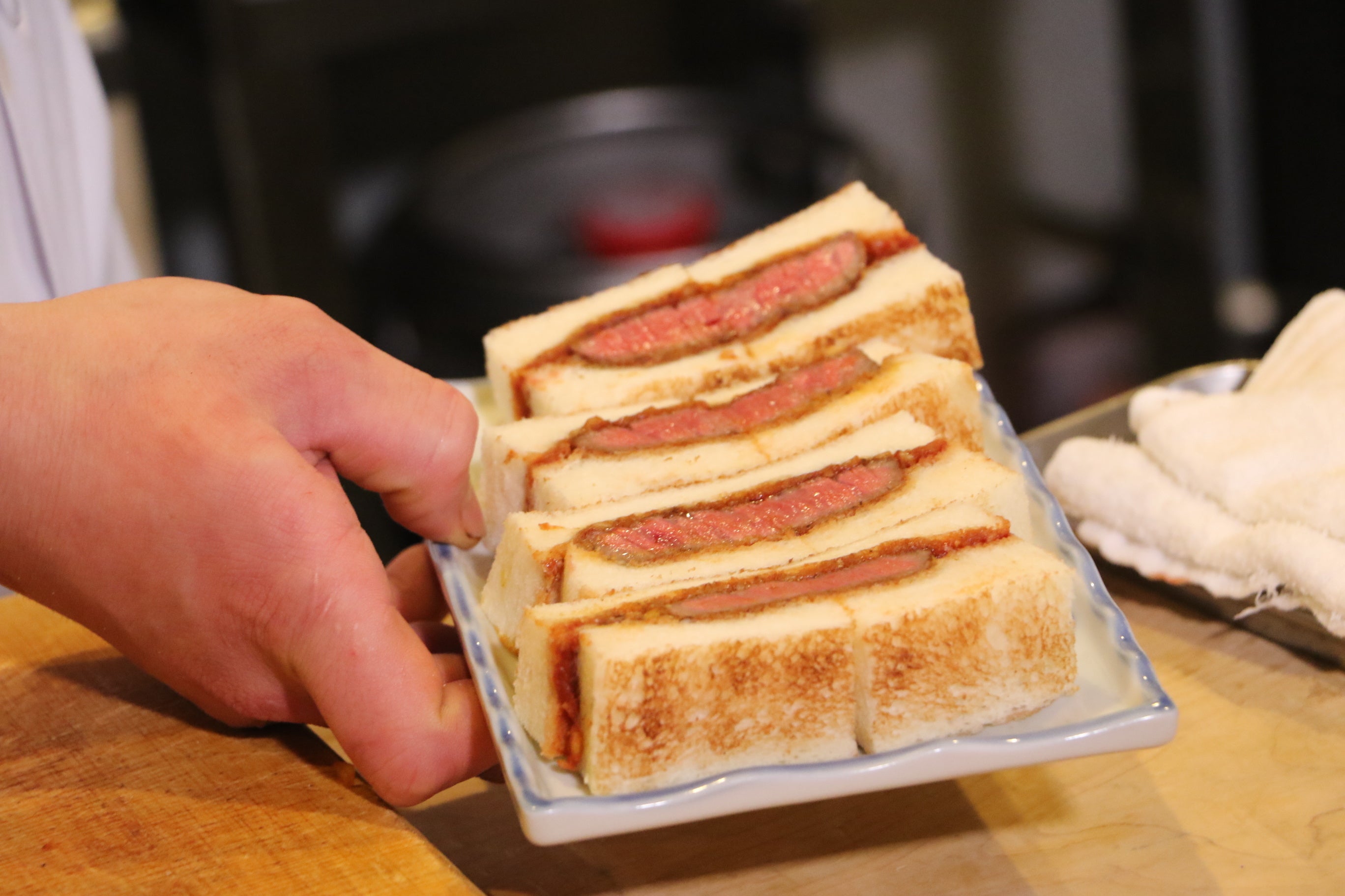 夕食はうまいもん好きの大人が集まる隠れ家居酒屋へ。上質な和牛のモモ肉を炭火で焼き上げた「和牛炭焼サンドウィッチ」をいただきます。
