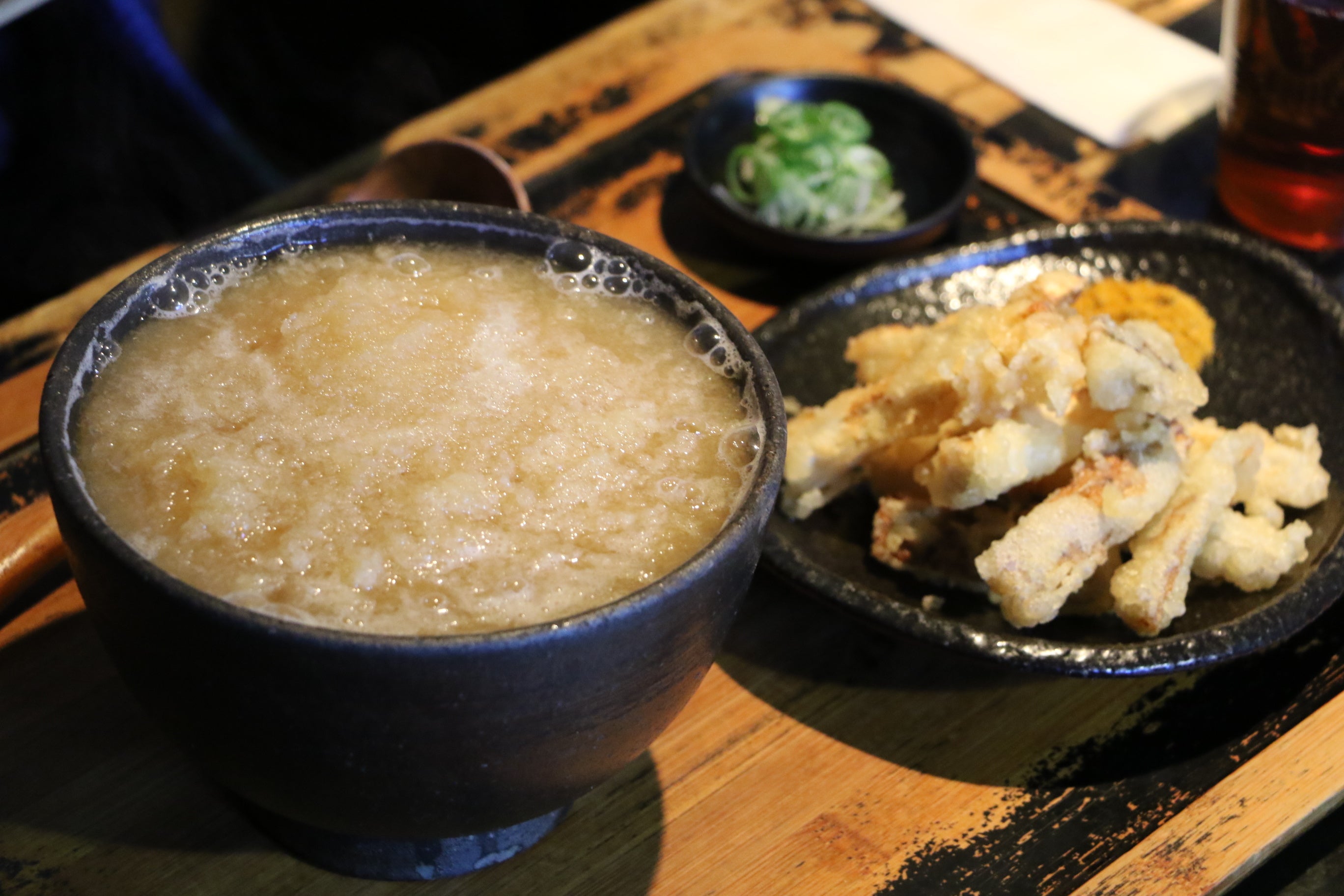 お昼は行列の絶えないうどん店で、人気の「土ごぼうみぞれうどん」をいただきます。