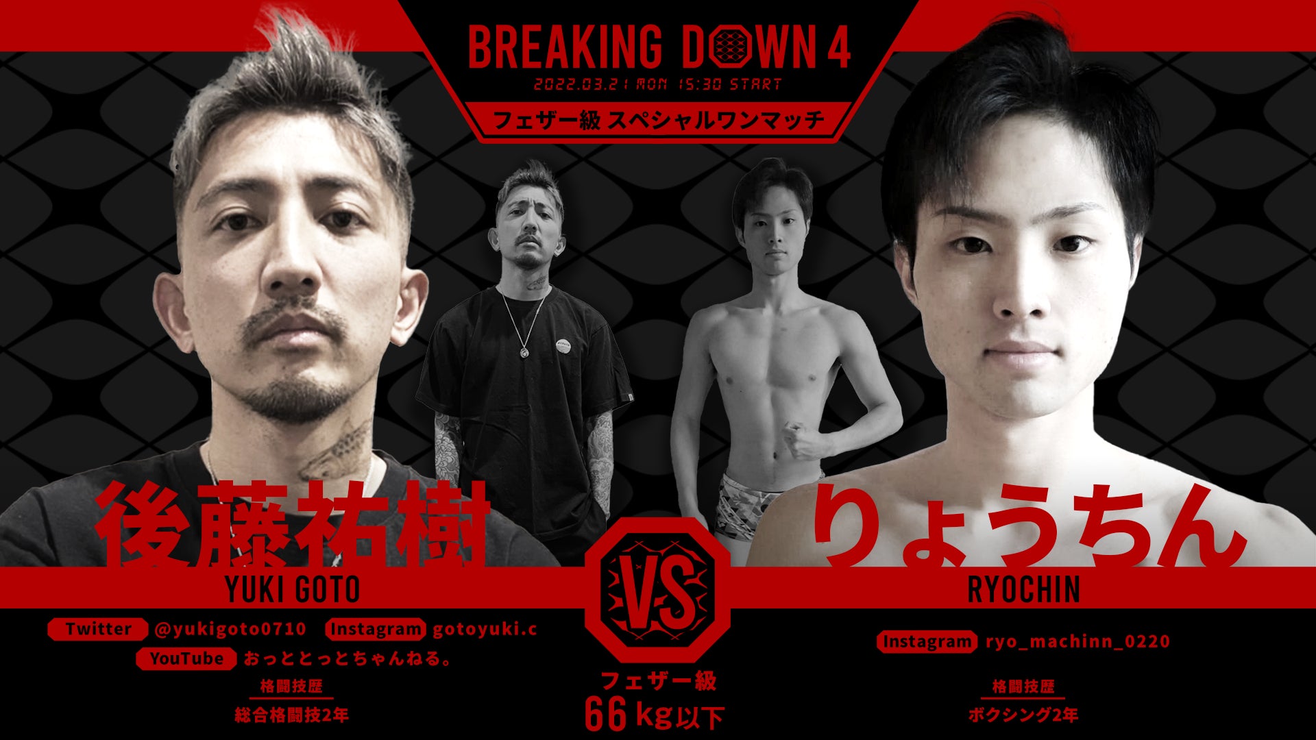 「1分1ラウンド」で最強を決める、最強で最⾼の総合格闘技エンターテインメントBreakingDown(ブレイキングダウン)は、第4回⼤会として『SHARE JEWEL presents BreakingDown』を2022年3⽉21⽇(⽉・祝)に開催します。本⽇3⽉16⽇(⽔)19:00より、朝倉未来YouTubeチャンネルにて3つ⽬のオーディション動画を公開します。それに合わせて、第4回⼤会の試合数が全11試合であること、またそのうちの6試合の対戦カードを公開いたします。