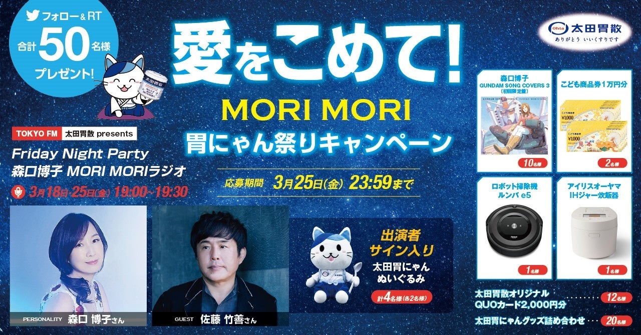 本キャンペーンは同社が提供しているTOKYO FM1ヶ月間限定プログラム『太田胃散 presents Friday Night Party 森口博子 MORI MORIラジオ』(3月18日・25日(金)19:00~OA)とのコラボ企画となっておりますので、ぜひ番組もお聴きください。