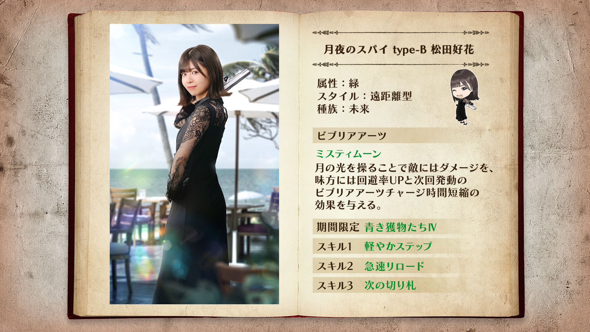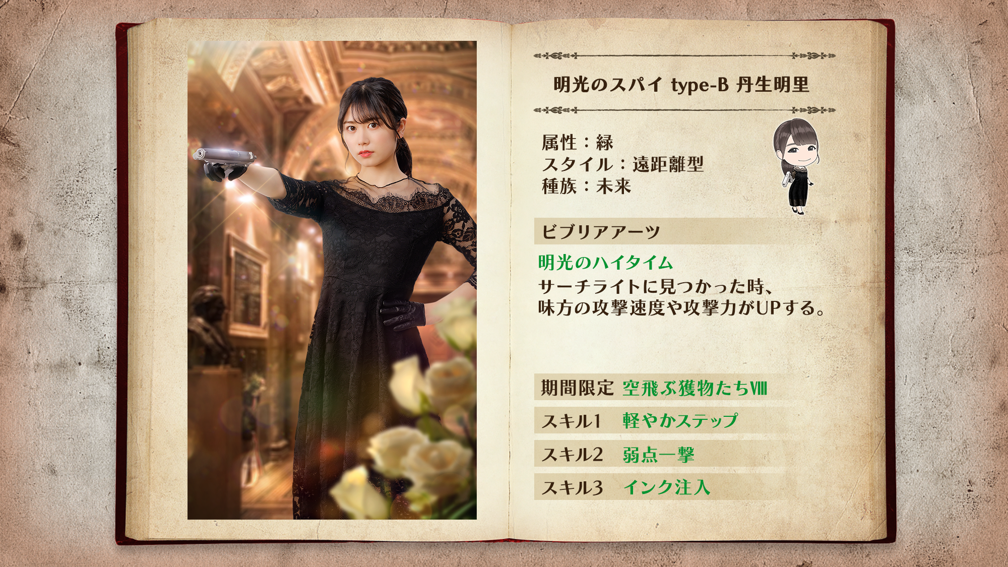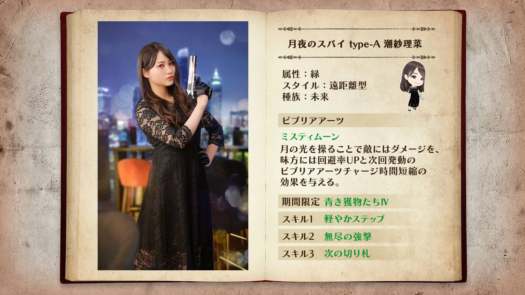 「★4 明光のスパイ」は味方の攻撃速度と攻撃力をUPさせるビブリアアーツ「明光のハイタイム」を、「★4 月夜のスパイ」は味方のビブリアアーツチャージの時間を短縮させるビブリアアーツ「ミスティムーン」を所持しています!