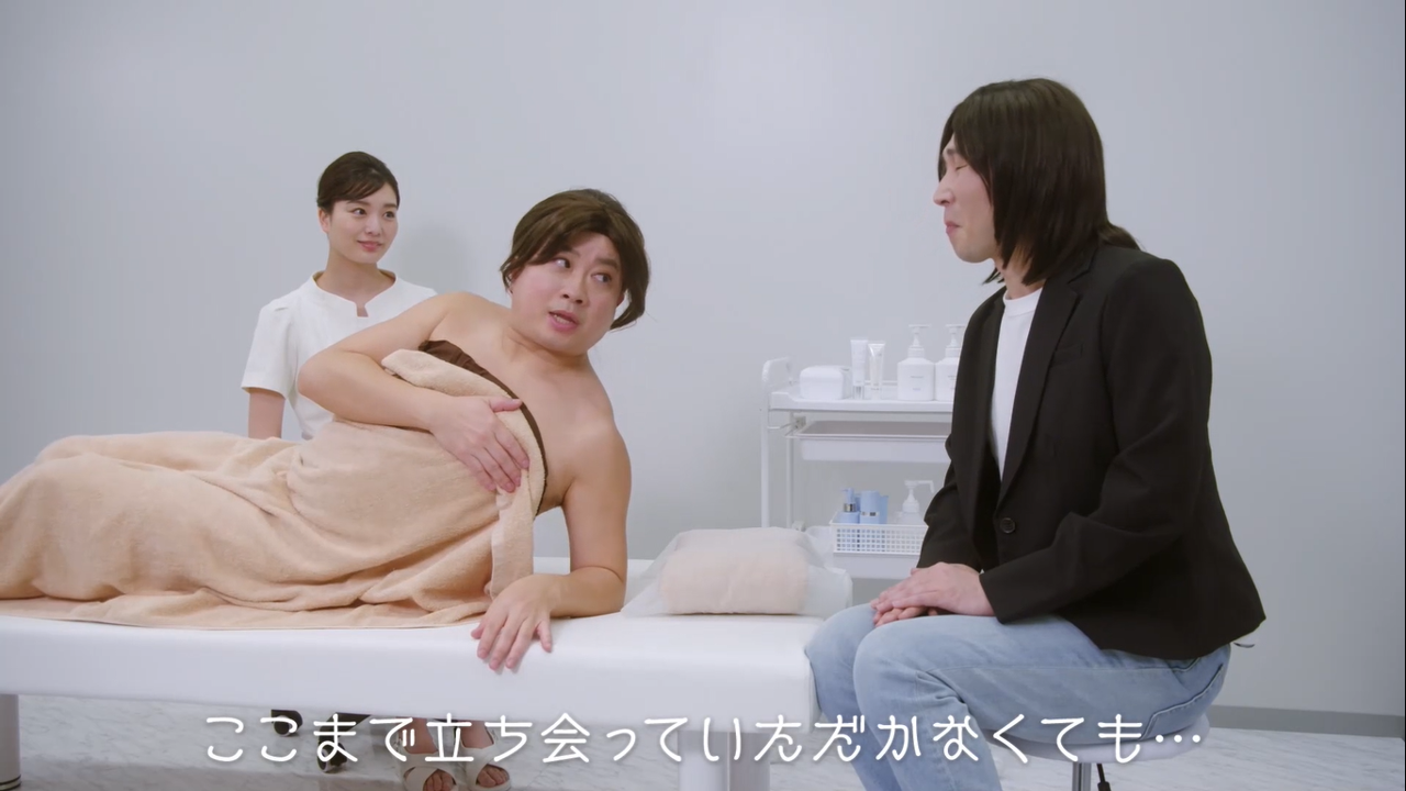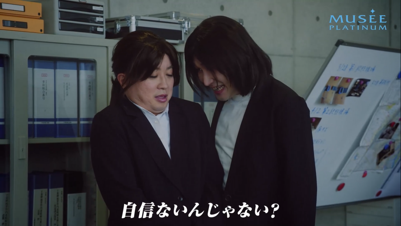 今回のCMでは「“声でか”刑事」として、男性刑事に扮した長田さんと長谷川さん、女性刑事役のじろうさんの3人が“大声”で会議をしている様子からスタート。途中から新人女性刑事として松尾さんが登場しますが、自信がなくうまく大声が出せません。そんな松尾さんがミュゼプラチナムに通うことで自信を持ち、「“声でか”刑事」として大声が出せるようになる、というストーリーです。