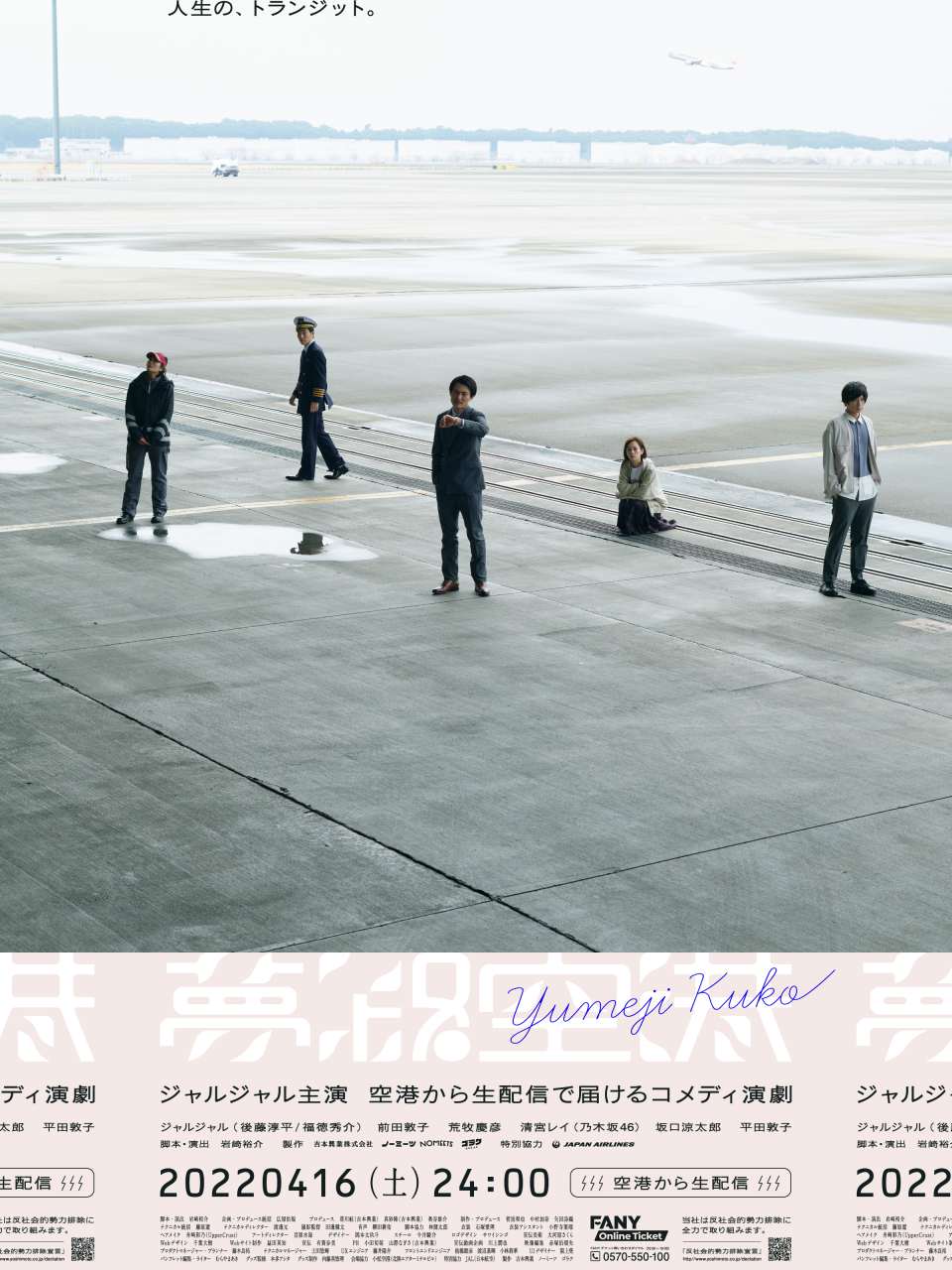 また、今回の公演制作の過程を密着ドキュメントとして、YouTubeチャンネル「ジャルジャルアイランド」で公開中。本作『夢路空港』を企画し作り上げていくのは、ジャルジャルの後藤淳平が扮する久地々プロデューサー。「編集をしない」ことを第一主義として活動してきた久地々でしたが、徐々に仕事が無くなり崖っぷちのなか、最後のチャンスとして挑戦するのが、空港を舞台にして生配信でお届けするコメディ演劇『夢路空港』です。海外への渡航が難しくなった今、空港を応援するとともに、多くの人が夢を持つことの大切さにもう一度気づいて欲しいという想いで企画。JAL(日本航空)へ熱意を持って打診したところ快諾いただき、深夜24時からの公演を条件に、石川県の「小松空港」を舞台として貸し出してくださることが決定しました(※)