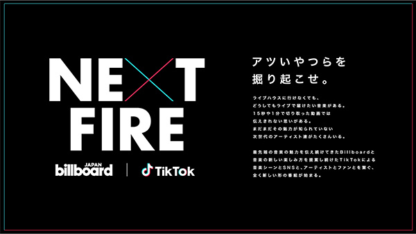 また番組は、今回より3rd seasonに突入します。2020年10月のスタートから、これまで優里、川崎鷹也、Tani Yuuki、にしな など、多くのアーティストをフックアップしてきた『NEXT FIRE』。Billboard JAPANとTikTokは4月からも引き続き、次世代アーティストの発掘やライブの新体験を創出し、機能やコーナーの拡充に合わせアーティスト支援に繋がる様々な方法を模索してまいります。