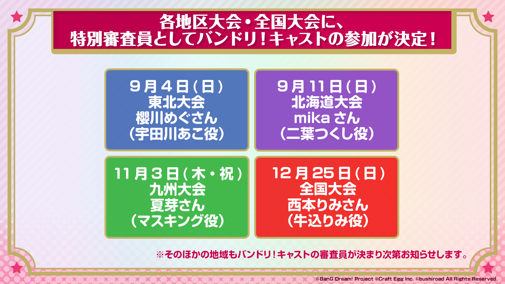 また、各地区グランプリ大会・全国大会に、特別審査員としてバンドリ!キャストの参加が決定。