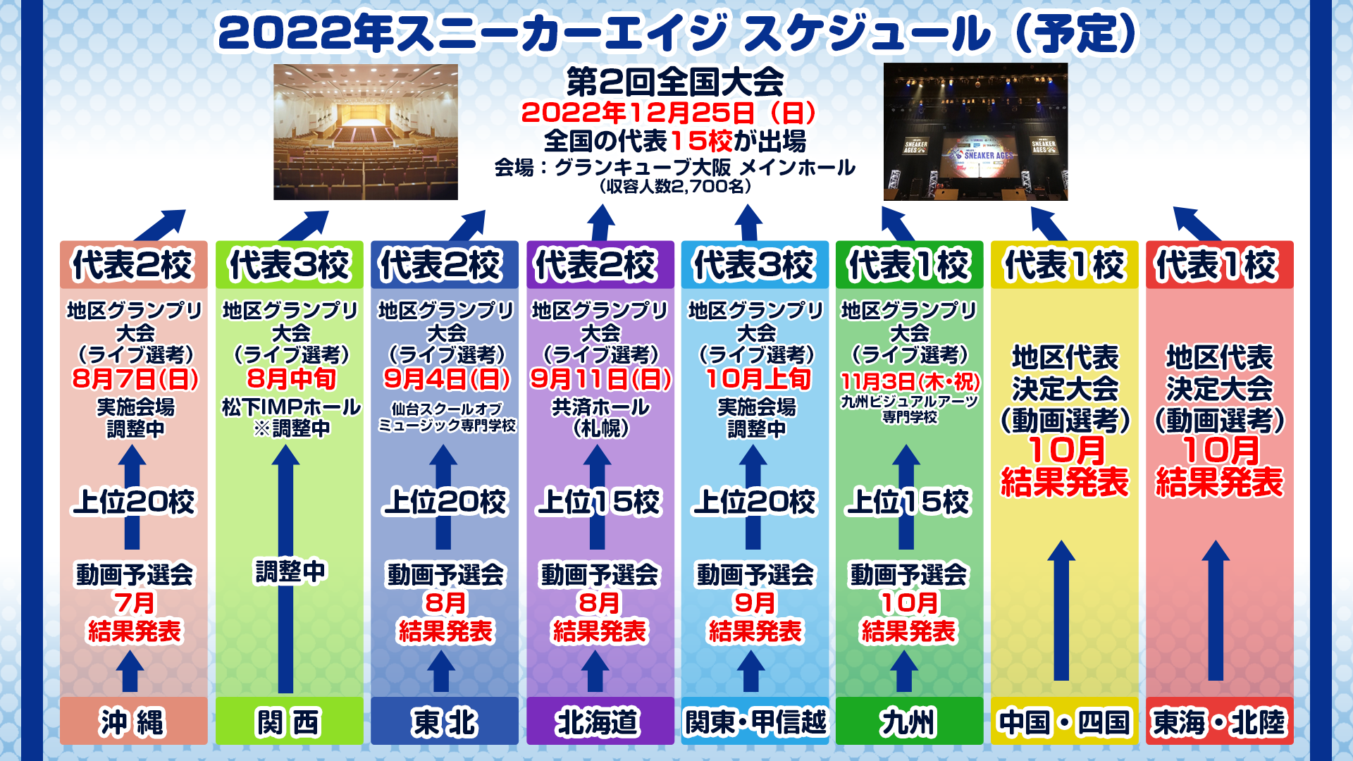 全国高校軽音楽部2000校分の1を決める大会、第2回全国高校軽音楽部大会「we are SNEAKER AGES」が今年も開催決定。全国大会は2022年12月25日(日)にグランキューブ大阪 メインホールで実施予定。夏以降に各地区グランプリ大会の開催を予定している。