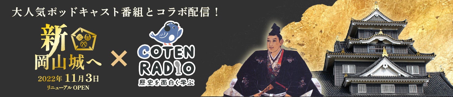 岡山市、公益社団法人おかやま観光コンベンション協会、山陽新聞社でつくる「おかやま城下町物語実行委員会」は、豊臣秀吉に重用された岡山城主・宇喜多秀家の生涯を、人気の歴史系ポッドキャスト番組「歴史を面白く学ぶコテンラジオ(COTEN RADIO)」とコラボレーションして全国に発信します。歴史ファン必聴のコンテンツ。配信は3月21日から全3回です。「COTEN RADIO」と自治体のタイアップ(コラボレーション)は全国初の試みとなります。現在「令和の大改修」のさなかにある岡山城に、思いをはせてください!。岡山城のリニューアルオープンは令和4年(2022年)11月3日です。