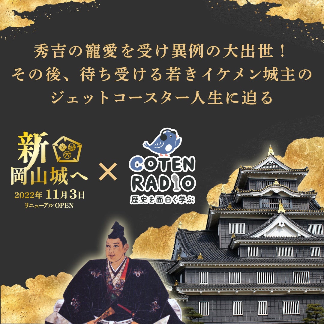 岡山市、公益社団法人おかやま観光コンベンション協会、山陽新聞社でつくる「おかやま城下町物語実行委員会」は、豊臣秀吉に重用された岡山城主・宇喜多秀家の生涯を、人気の歴史系ポッドキャスト番組「歴史を面白く学ぶコテンラジオ(COTEN RADIO)」とコラボレーションして全国に発信します。歴史ファン必聴のコンテンツ。配信は3月21日から全3回です。「COTEN RADIO」と自治体のタイアップ(コラボレーション)は全国初の試みとなります。現在「令和の大改修」のさなかにある岡山城に、思いをはせてください!。岡山城のリニューアルオープンは令和4年(2022年)11月3日です。
