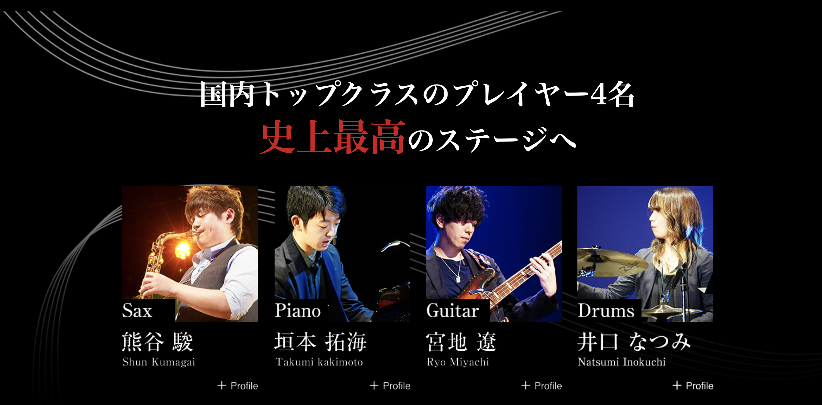 熊谷駿に加え、アメリカにて精力的に活躍するピアニストの垣本拓海、フジロックをはじめ国内外のフェスにも出演を果たし精力的に活動する、ベーシスト宮地遼、そしてオールジャンルを叩きこなし全国を駆け回る売れっ子実力派ドラマー、井口なつみとの共演である。