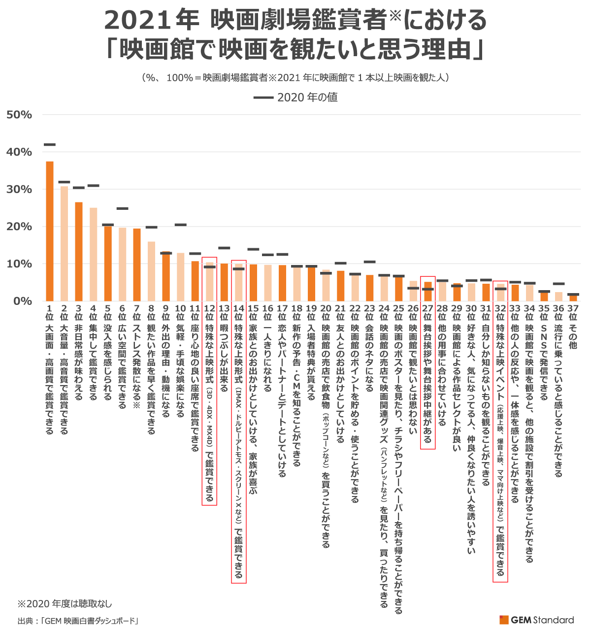 新型コロナウイルスの流行により、映画館で映画を観る「映画劇場鑑賞者」は減少を続けています。さらに、映画館で映画を観たいと思う理由が全体的に減少していることも分かりました。しかし、そういった厳しい状況下でも、IMAX・4DX・MX4Dなどの特殊上映形式を映画館で映画を観たい理由にあげている割合は前年を上回っていることが判明しました。最新の「GEM映画白書ダッシュボード」を用いて、これら詳細を紐解いていきます。