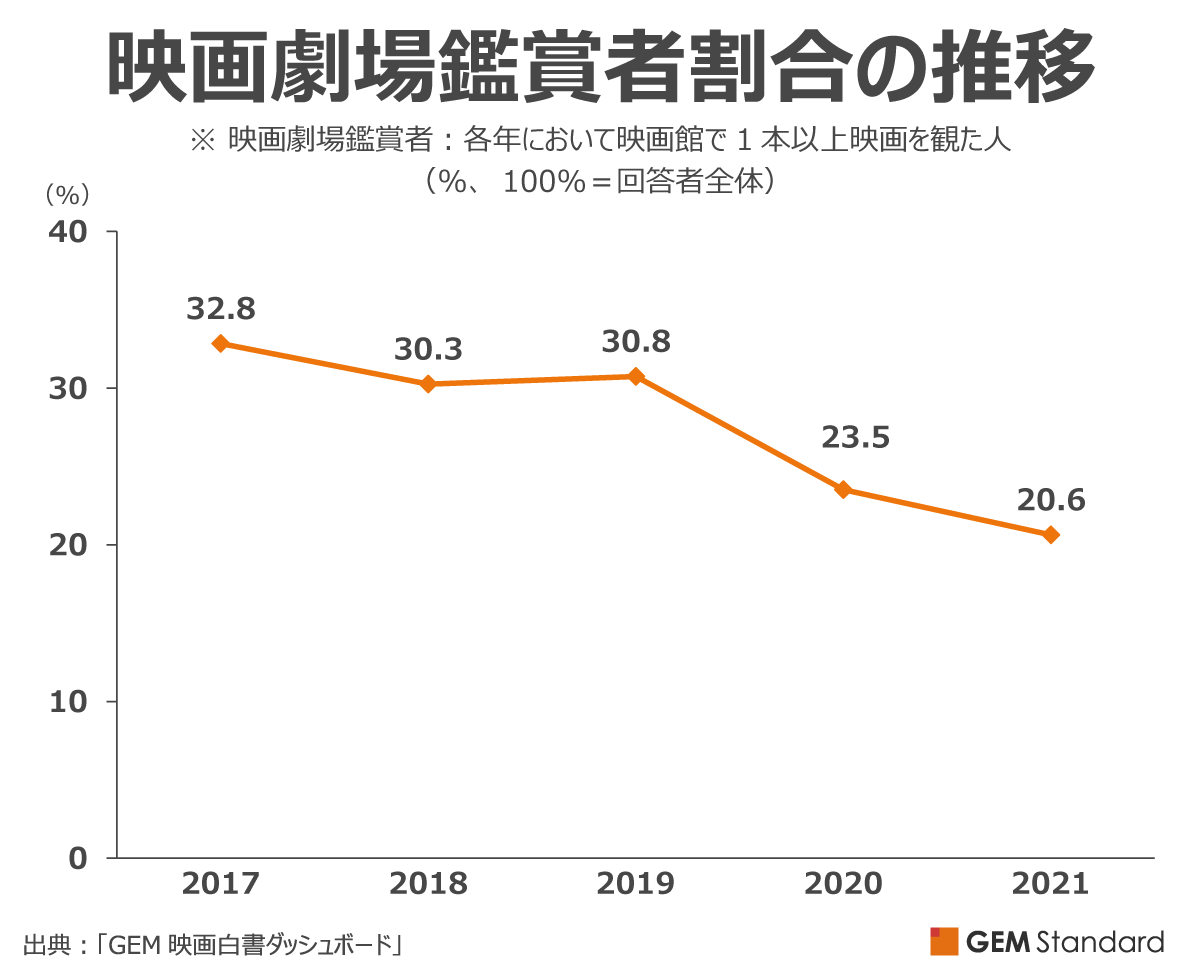 上記は、「GEM映画白書ダッシュボード」調査対象者の15歳から69歳に占める映画劇場鑑賞者(1年間に映画館で1本以上映画を観た人)の割合です。新型コロナウイルスが流行した2020年に大きく減少した後、減少幅は小さくなりましたが、2021年においても減少し、約20%となっています。