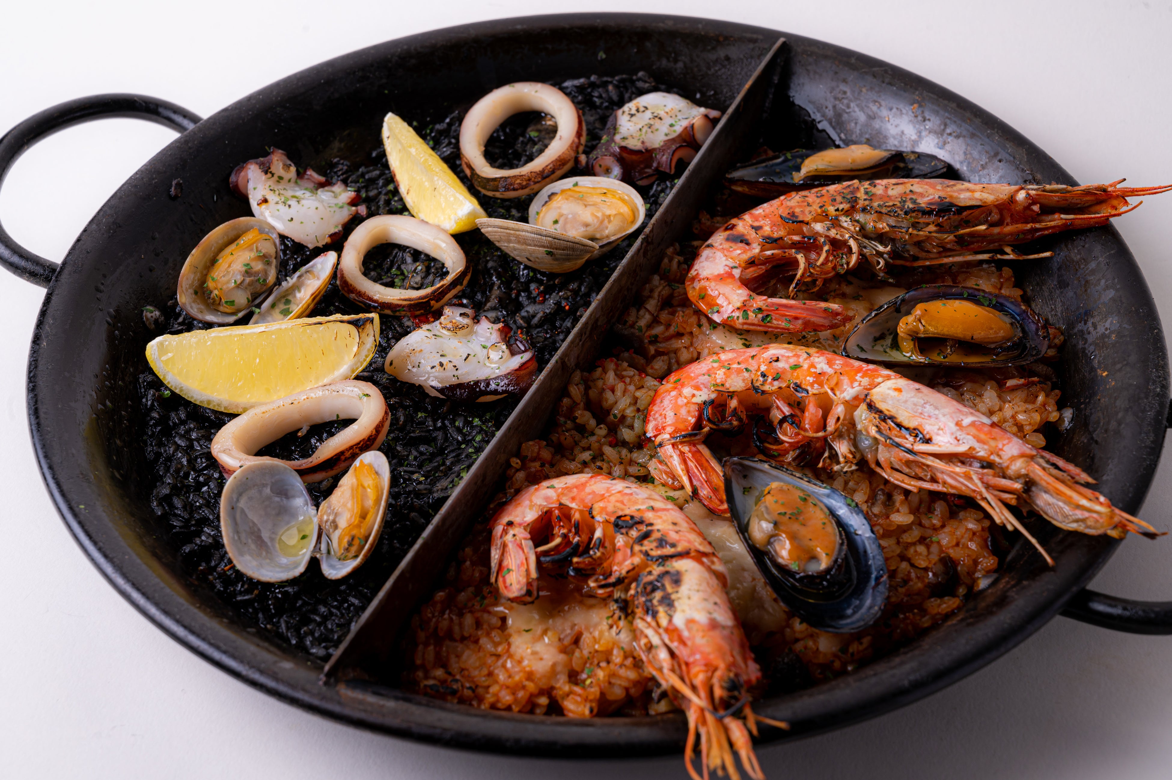 魚介のトマト&イカスミのハーフアンドハーフパエリア 1人前1,078円(2人前~)
