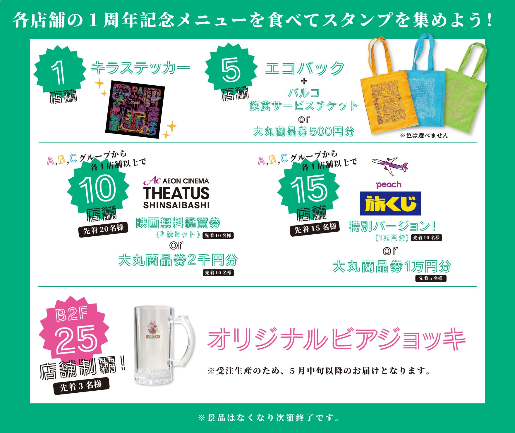 概要:期間中、心斎橋パルコおよび大丸心斎橋店の対象店舗にて1周年記念メニューをご飲食されたお客様に、ご利用店舗数に応じてプレゼントを進呈。
