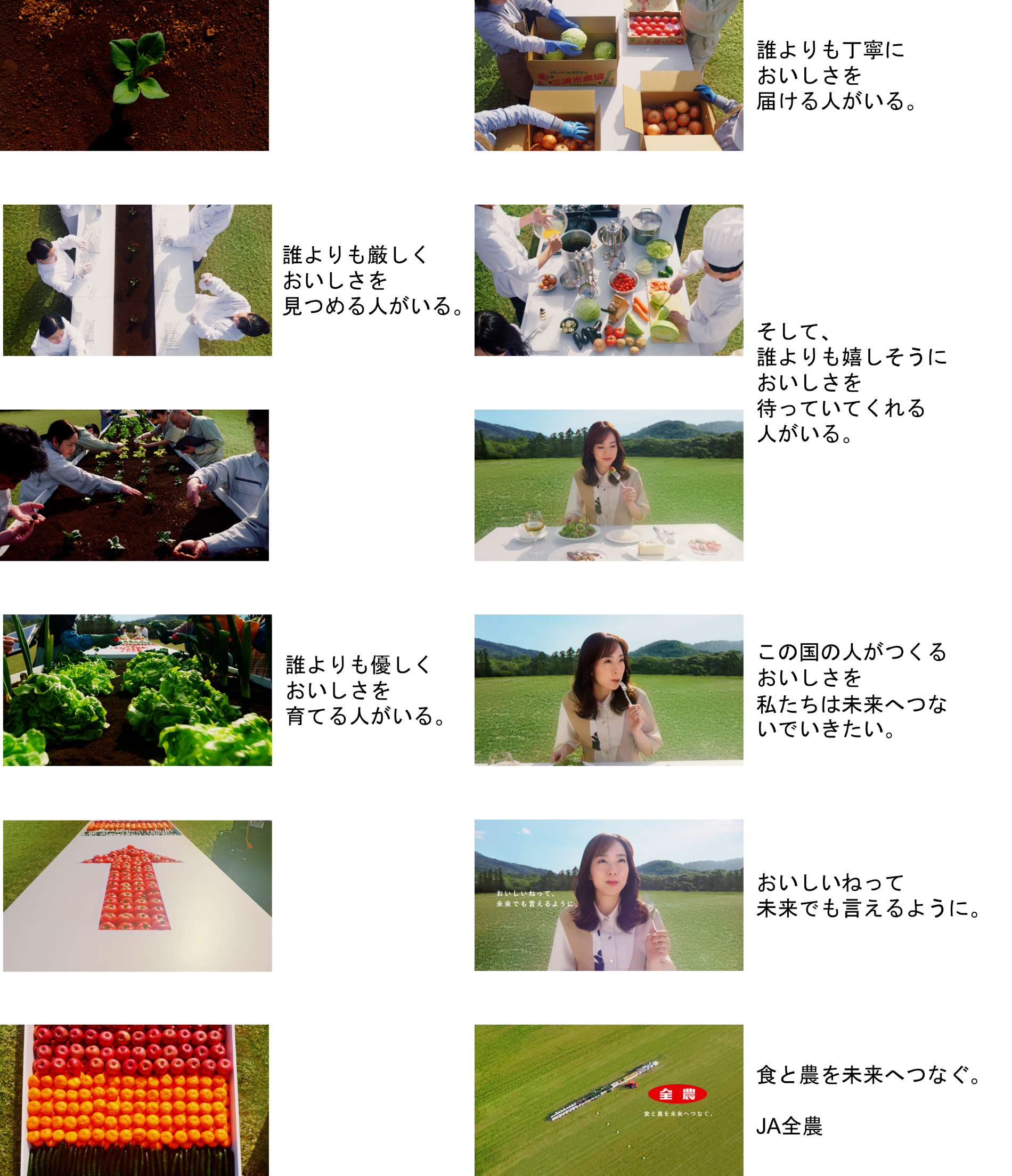 おいしさを待っていてくれる人のために。おいしいねって、未来でも言えるように。誰よりも厳しくおいしさを見つめ、優しく育て、丁寧に届ける。全農の「食と農を未来へつなぐ。」というメッセージをストレートに伝える新CMとなっております。