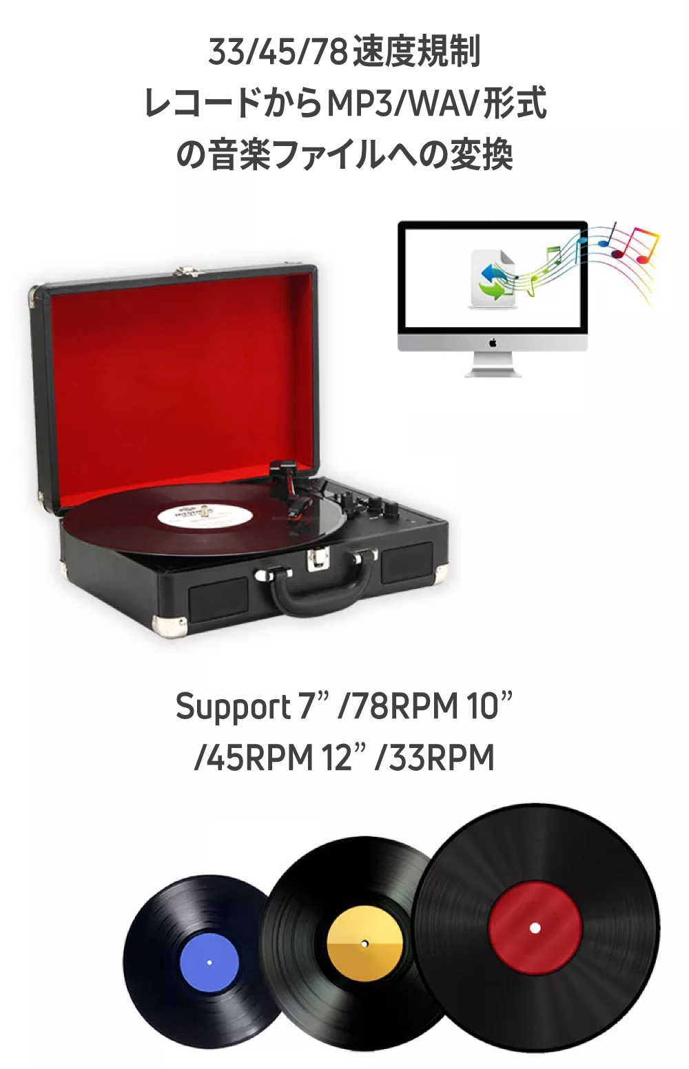 LP盤(33 1/3回転)、EP盤(45回転)、SP盤(78回転)に対応。