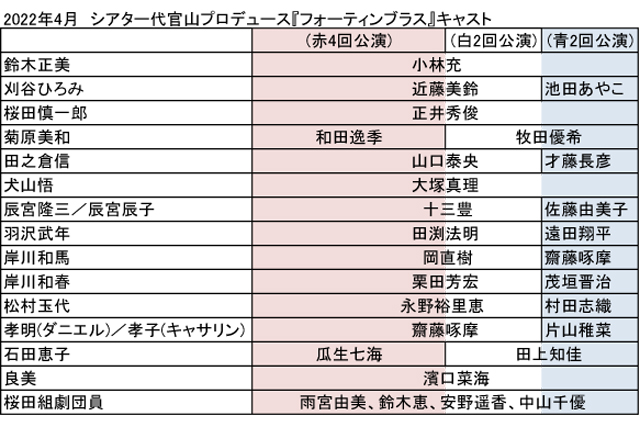 青:小林充、池田あやこ、正井秀俊、牧田優希、才藤長彦、大塚真理、佐藤由美子、遠田翔平、齋藤啄摩、茂垣晋治、村田志織、片山稚菜、田上知佳、濱口菜海、雨宮由美、鈴木恵、安野遥香、中山千優