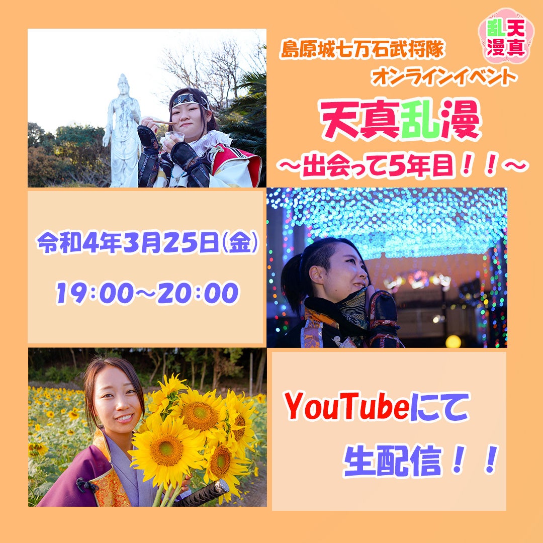 島原城を拠点に活動する島原城七万石武将隊がオンラインイベント「天真乱漫~出会って5年目!!~」を開催いたします。