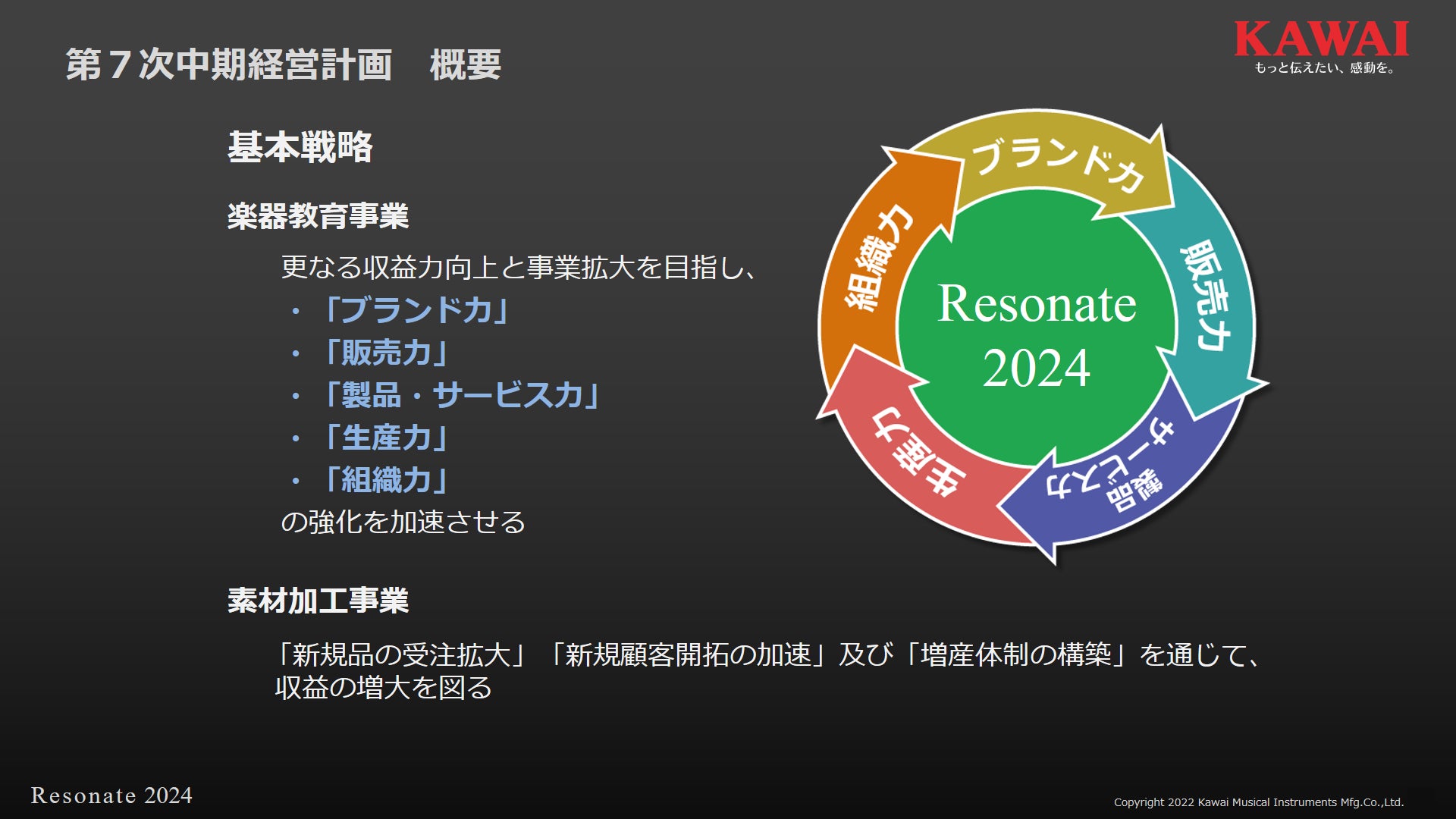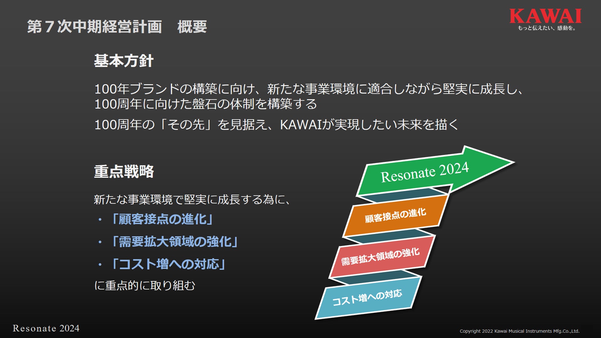 ・中期経営計画「Resonate 2024」策定のお知らせ:https://www2.kawai.co.jp/ir/pdf/2022/disclo_20220325.pdf