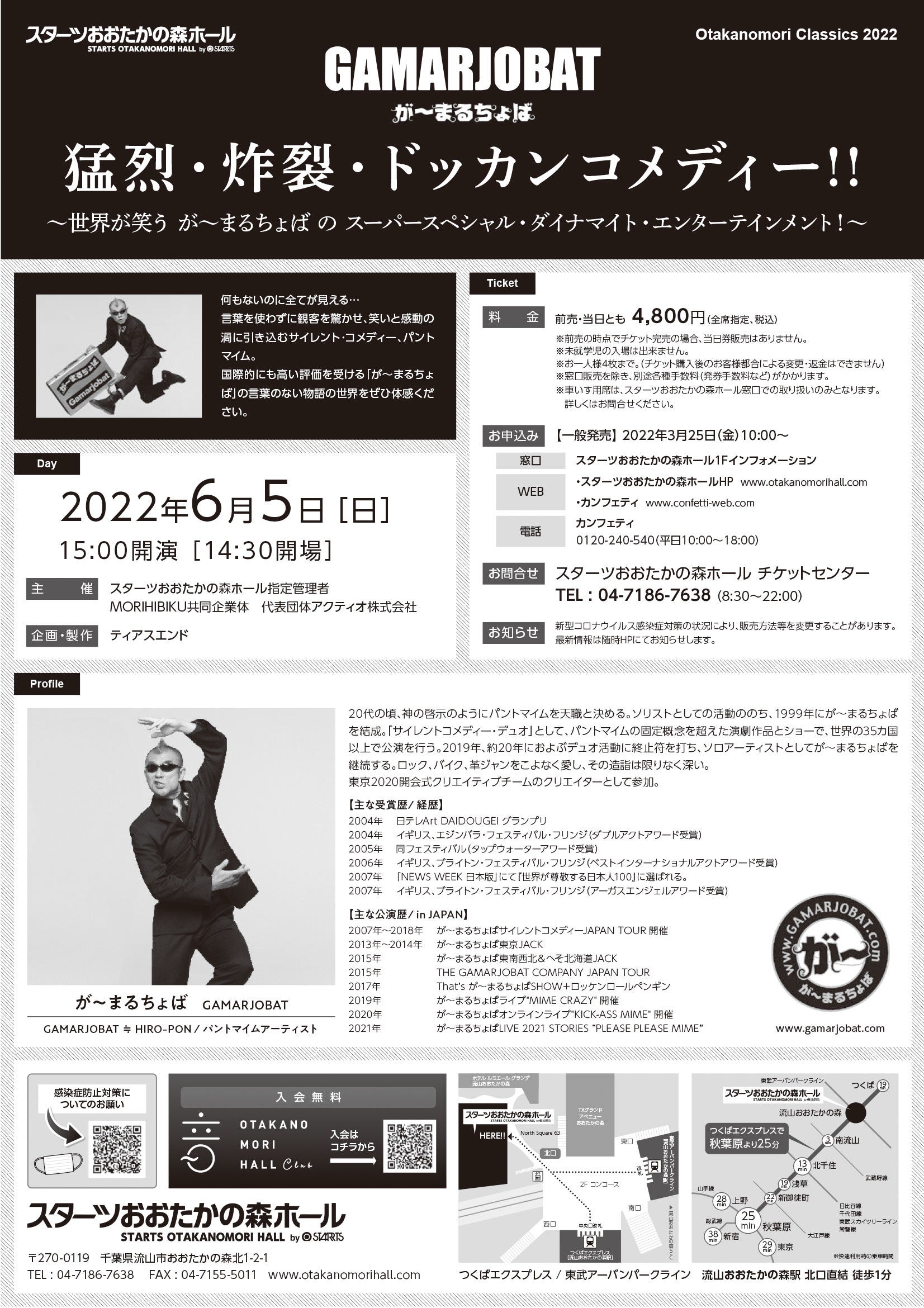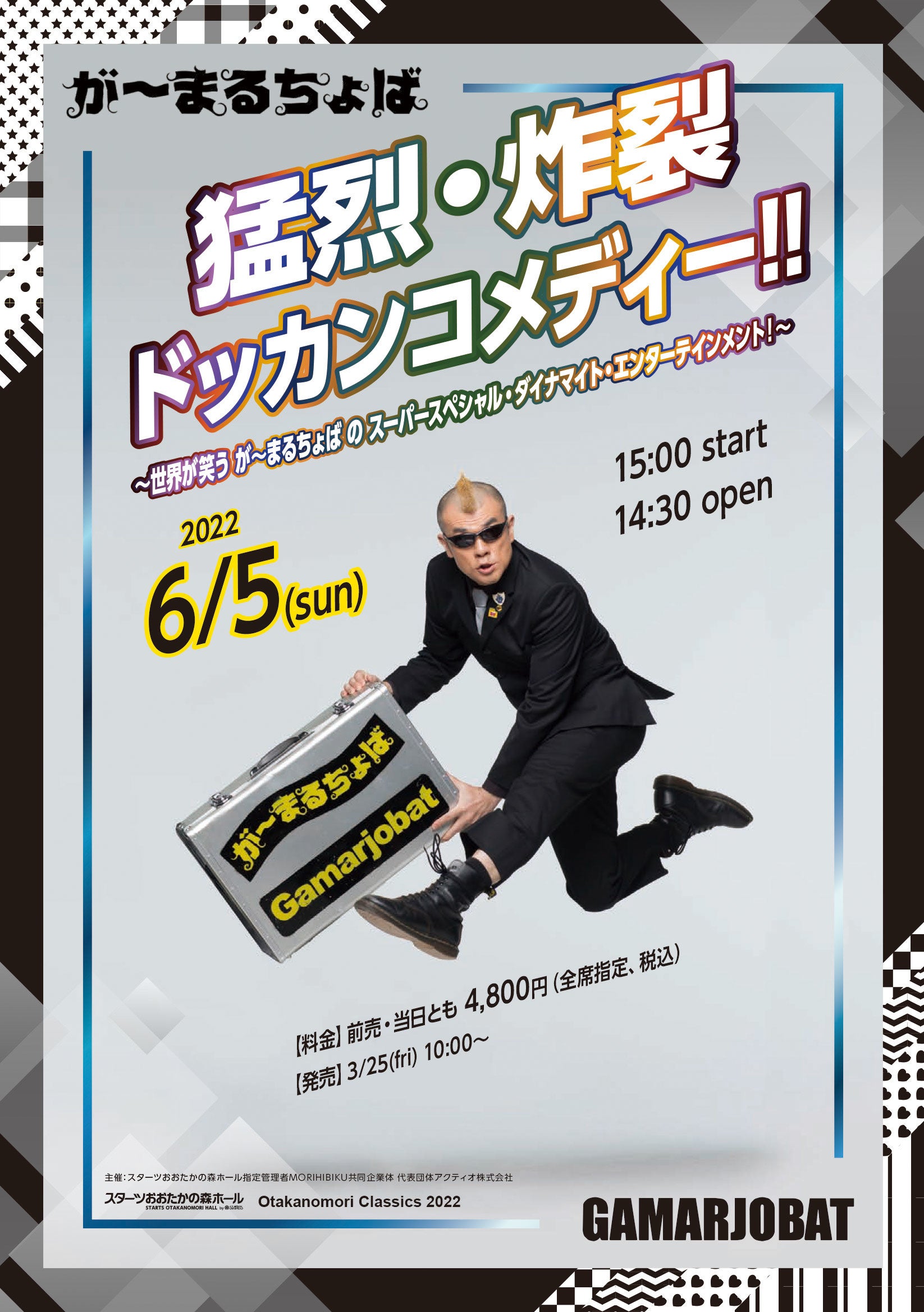 スターツおおたかの森ホール指定管理者MORIHIBIKU共同企業体 代表団体アクティオ株式会社主催、『が~まるちょば 猛烈・炸裂 ドッカンコメディー!! ~世界が笑う が~まるちょばのスーパースペシャル・ダイナマイト・エンターテイメント!~』が2022年6月5日(日)にスターツおおたかの森ホール(千葉県流山市)にて上演されます。チケットはカンフェティ(運営:ロングランプランニング株式会社、東京都新宿区、代表取締役:榑松 大剛)にて3月25日(金)より発売開始です。
