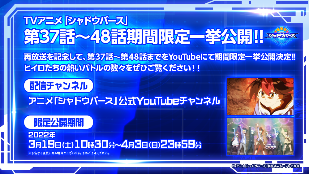- TVアニメ「シャドウバース」第37話~第48話をYoutubeにて期間限定で公開中!