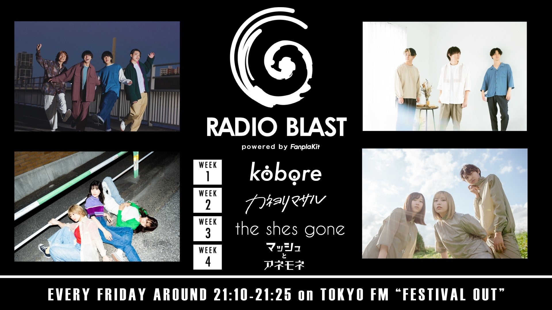 TOKYO FMで毎週金曜日21時から放送中の、“今、一番きいてほしい邦楽ロック”をお届けする番組『FESTIVAL OUT』では、番組内コーナー「RADIO BLAST powered by Fanpla Kit」の4月からの新コーナーMCを発表しました。新レギュラーMCはkobore(1週目)、カネヨリマサル(2週目)、the shes gone(3週目)、マッシュとアネモネ(4週目)です。4月1日(金)からの新たな顔ぶれのコーナーを、どうぞご期待ください。