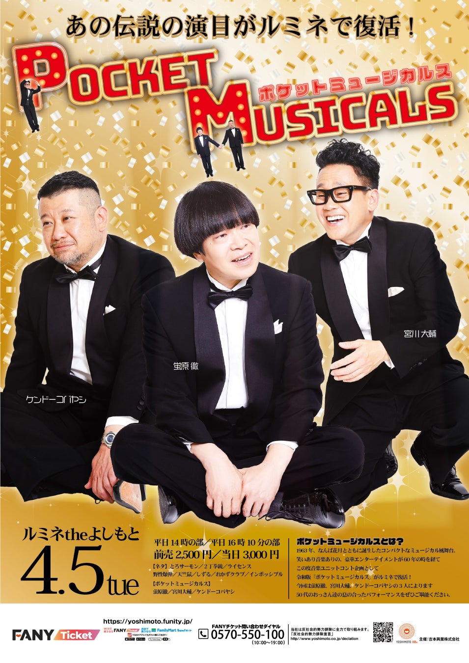 「なんば花月」オープン時に誕生した演目が“令和版”で復活!音楽ユニットコント『ポケットミュージカルス』4月から「ルミネtheよしもと」にてスタート!第1弾は、蛍原徹・宮川大輔・ケンドーコバヤシが出演!