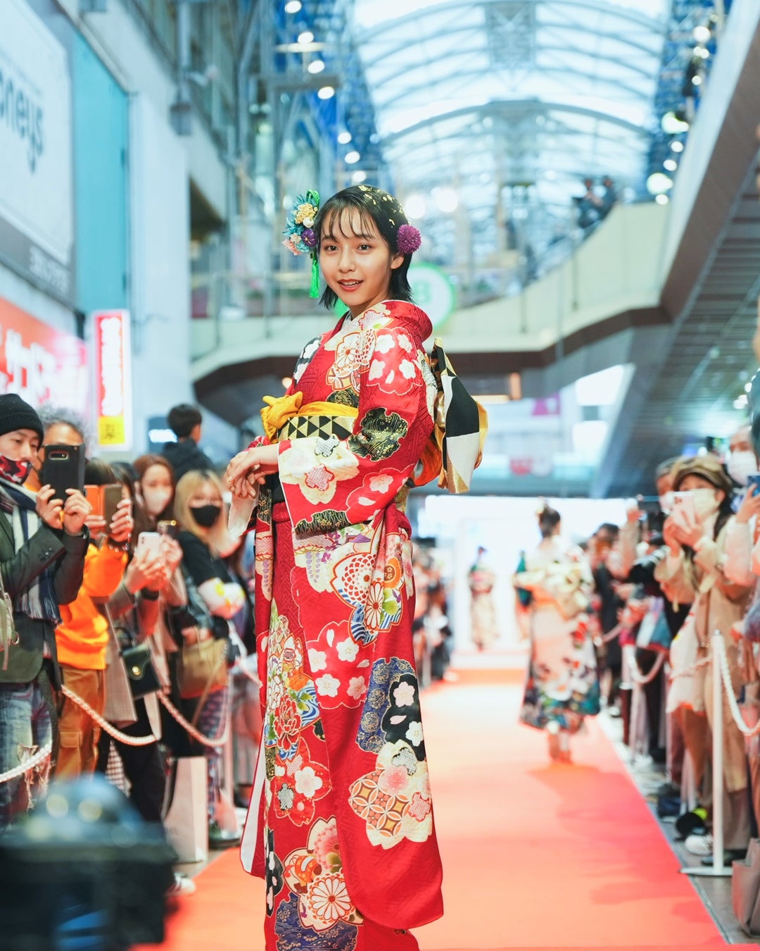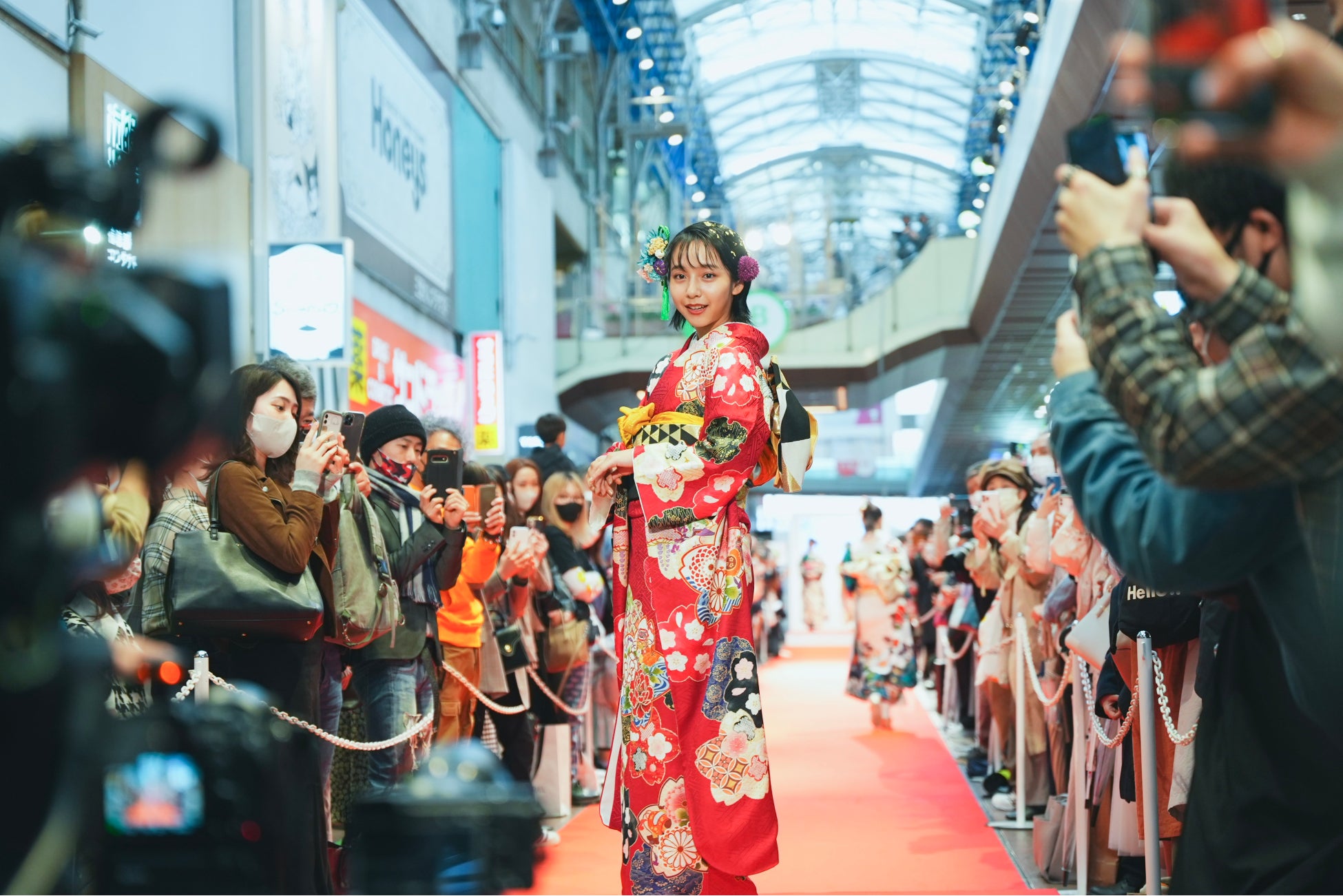 そして、ラストには華やかな赤の振袖を着用した山之内すずさんが登場。凛とした大人びた表情でランウェイを歩き、時折元気な笑顔や華麗なポージングで振袖の魅力を存分に表現いただき、お客さんの声援に時折手を振って応えるなど、地元・神戸でのステージを楽しまれていました。