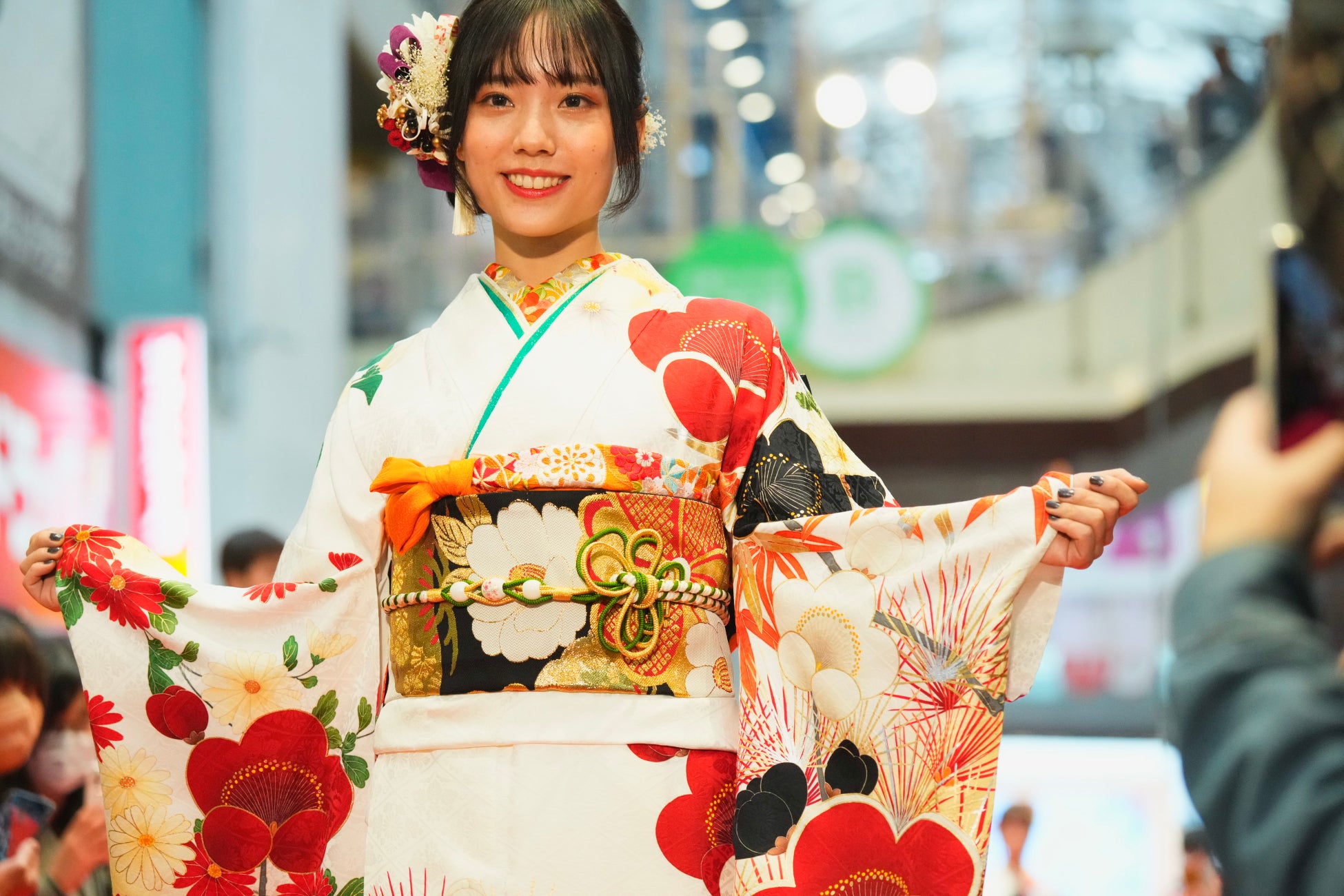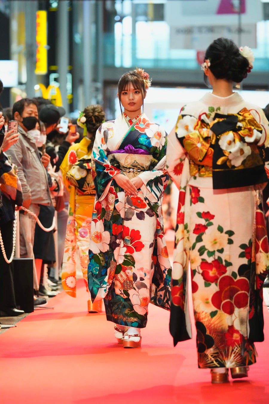 スペシャルステージは、SHOWROOMオーディションを勝ち抜いた一般のモデルさんたちのウォーキングからスタート。色とりどりの華やかな振袖を身にまとい、ランウェイトップでは、思い思いの華麗なポージングを披露しました。