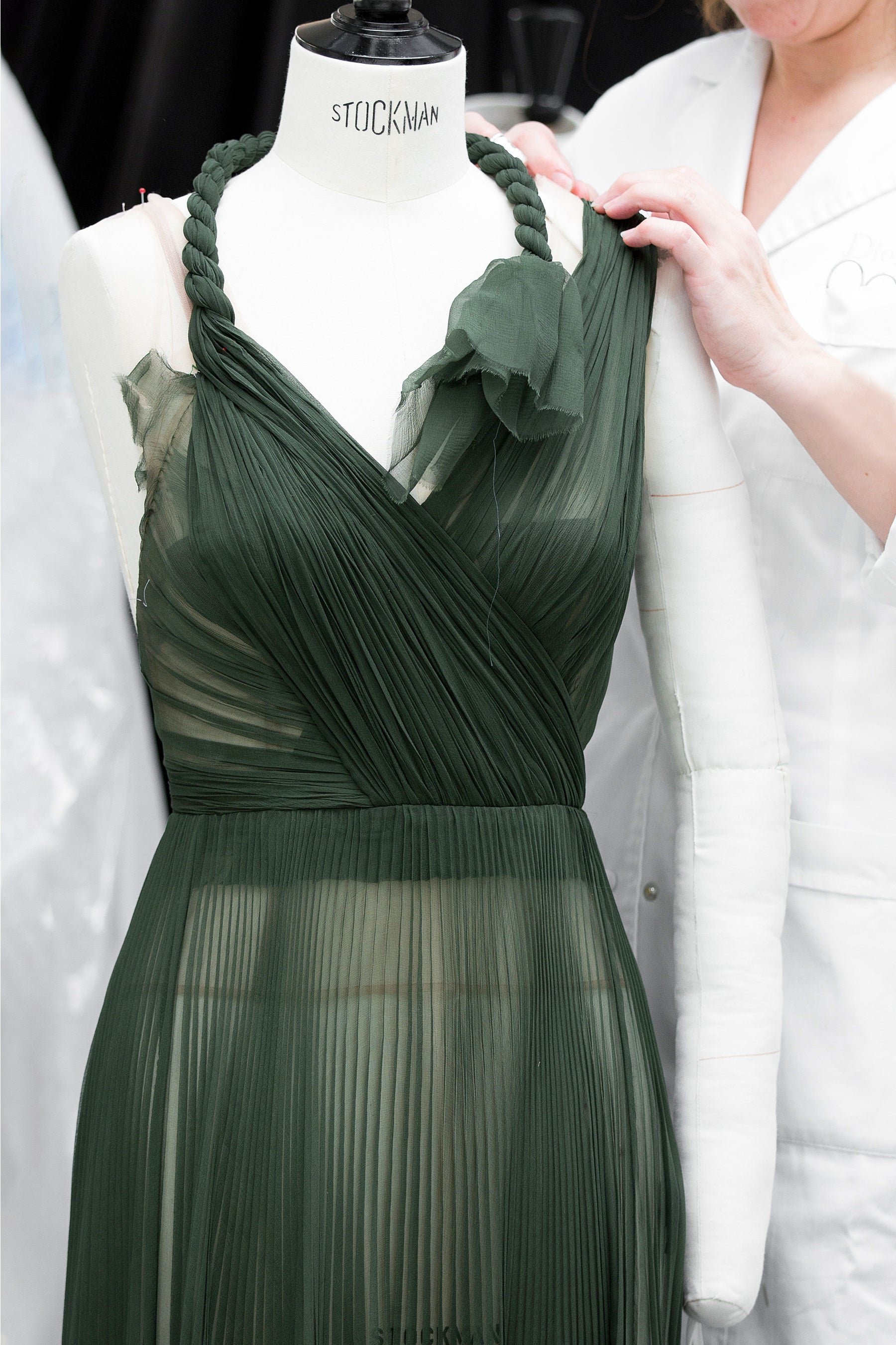 ナタリー・ポートマンは春夏 2020 オートクチュール コレクションから、ツイストがほどこされ、ドレープにシフォンプリーツがあしらわれたフォレストグリーンのペプラムドレスを纏い登場しました。プリーツとドレープが効いたシルクモスリンのアシンメトリートップの製作には150時間が費やされています。メイクアップはディオール ビューティー。