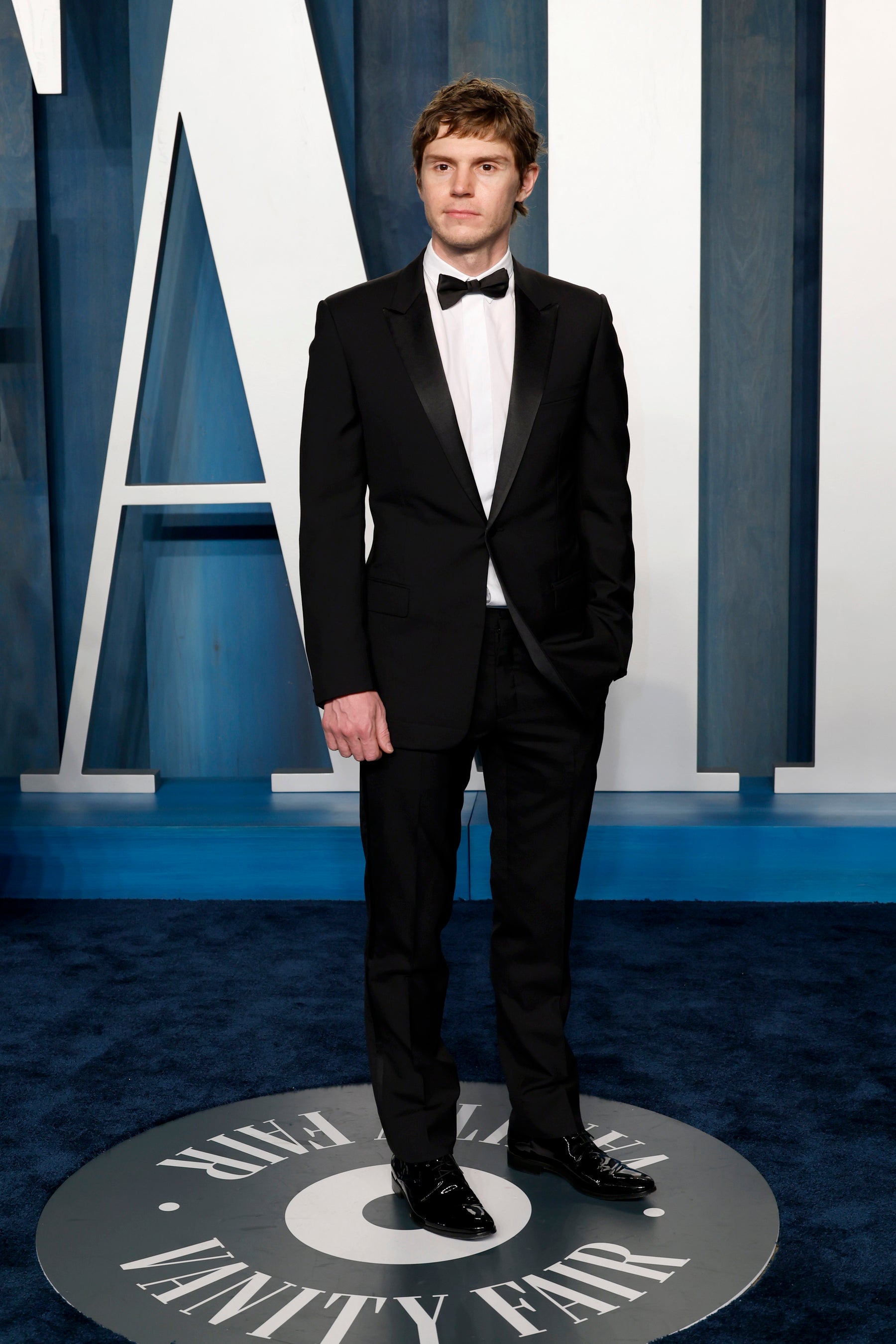 エヴァン・ピーターズはブラックのタキシードにホワイトのシャツ、ブラックのボウタイにパテントのダービーを合わせた装いで登場。