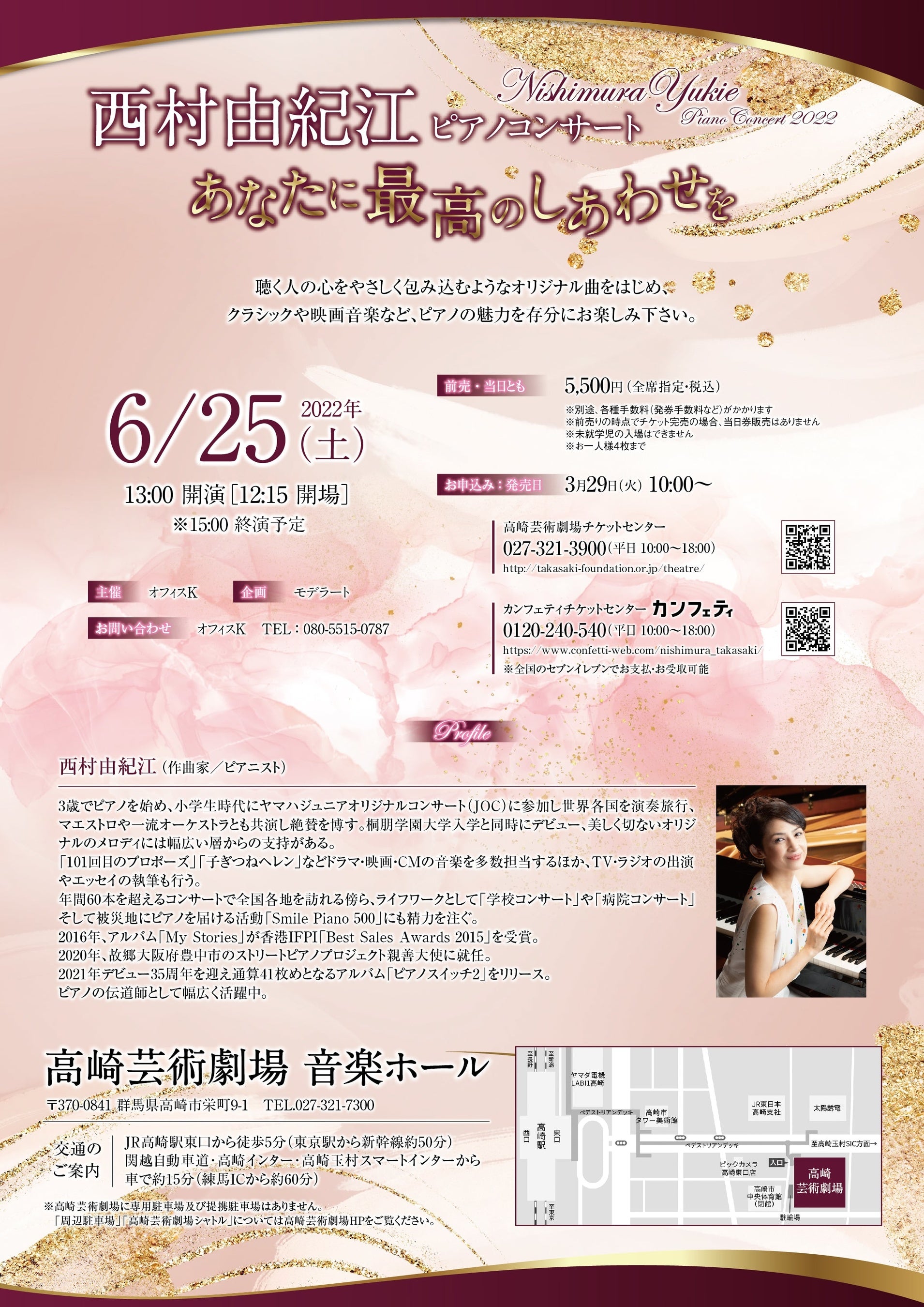 オフィスK主催、『〜あなたに最高のしあわせを〜 西村由紀江ピアノコンサート』が2022年6月25日 (土)に高崎芸術劇場 音楽ホール(群馬県高崎市)にて開催されます。チケットはカンフェティ(運営:ロングランプランニング株式会社、東京都新宿区、代表取締役:榑松 大剛)にて3月29日(火)10:00より発売開始です。