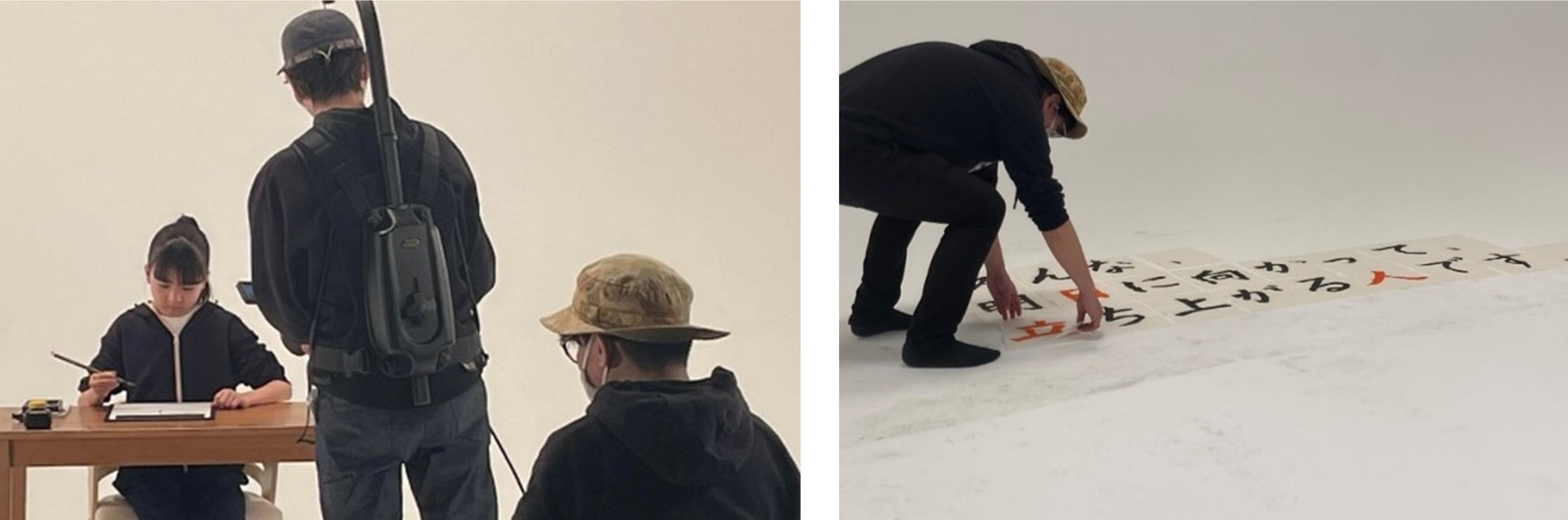 2022年2月末に都内で行われた撮影現場には、新津さんの書道の先生も立ち会いました。筆を手にした瞬間、11才の無邪気な笑顔から真剣な表情に変わりました。新津さんが書道をする姿をスタッフ一同、固唾をのんで見守っていました。集中して同じ文字を書き続け、先生にアドバイスを求める場面も。最後には納得がいく作品ができ、再び笑顔が戻りました。
