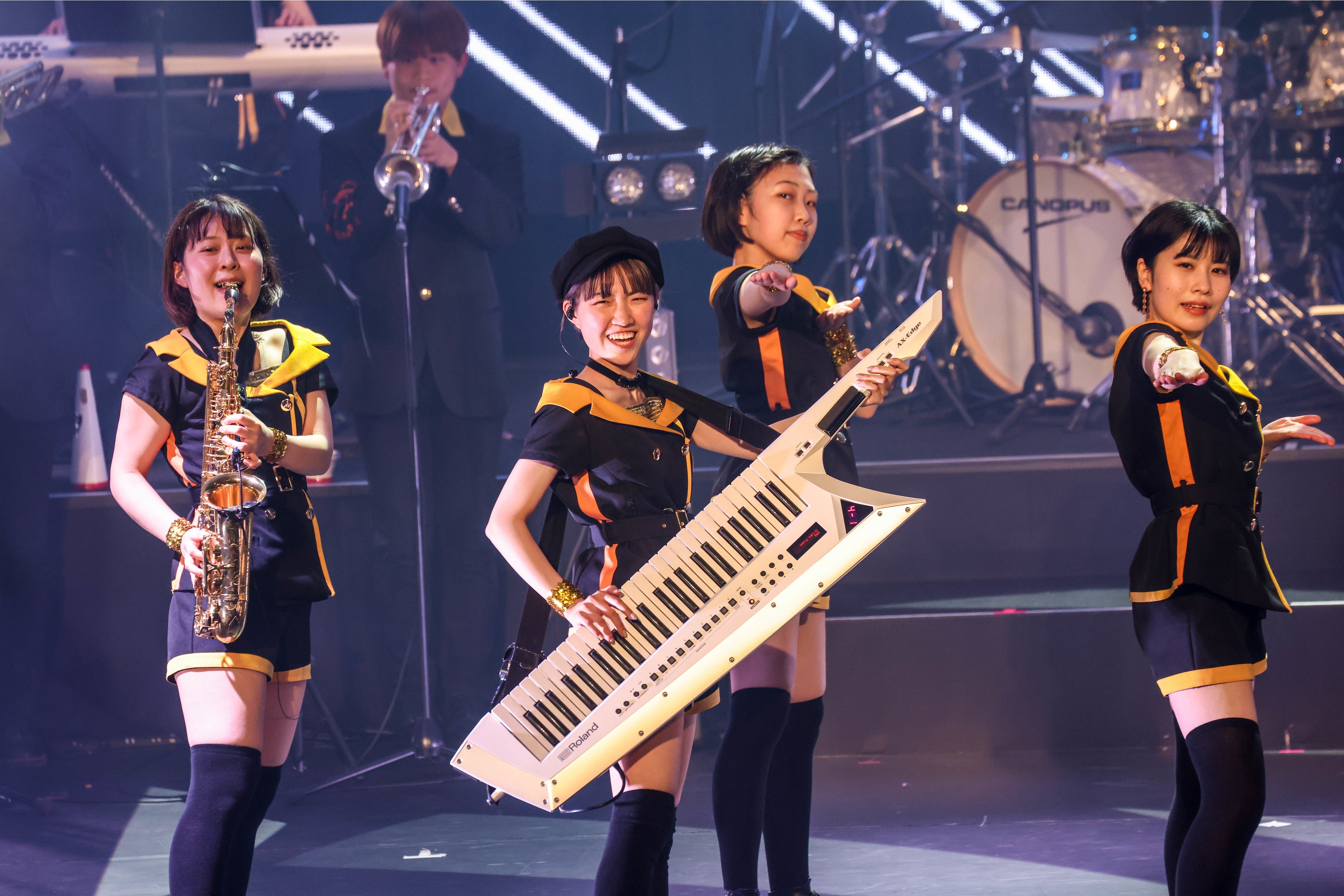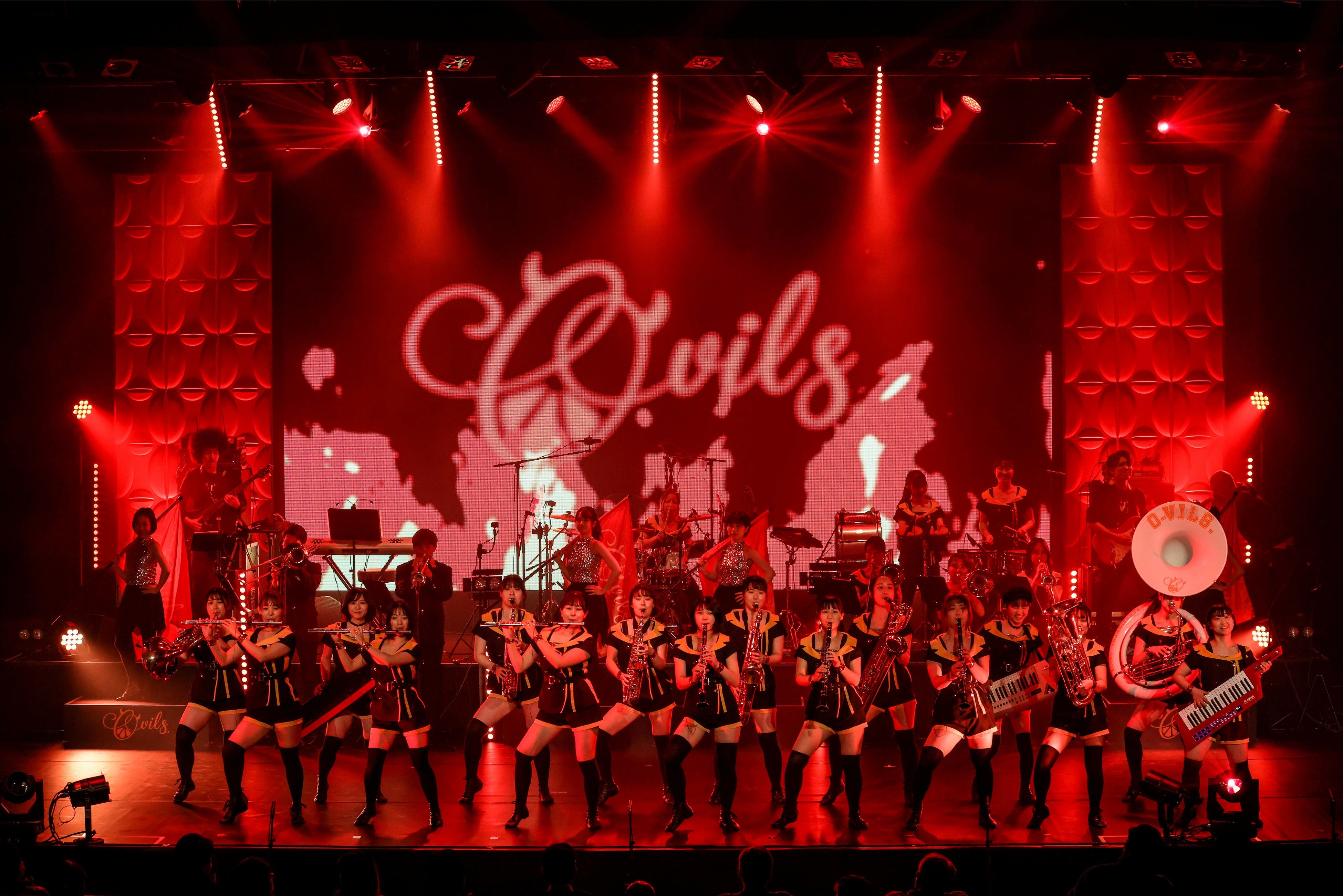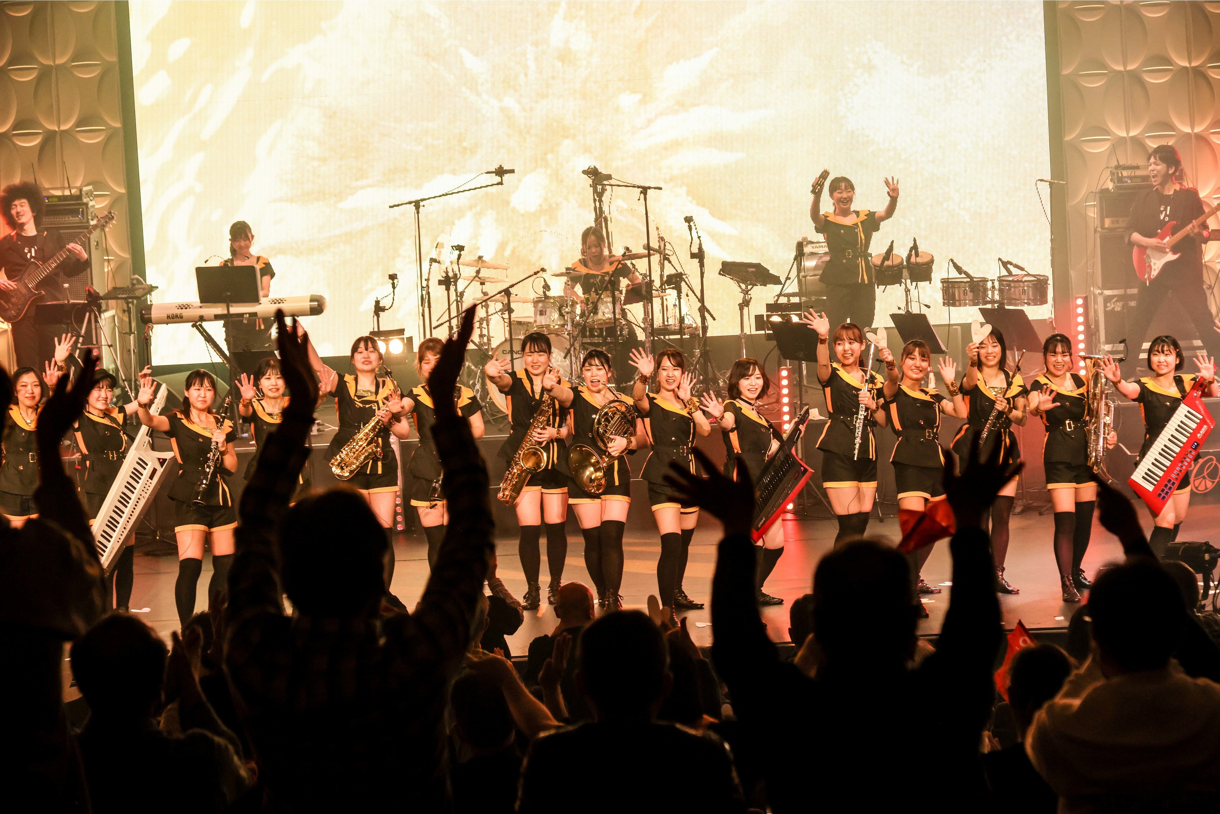 また、フルートのソロが一際美しく響き渡る『Amazing grace』では場内に澄んだ空気が満ちてゆき、観客も大きな拍手を送る。その後、『Get a way』でファンキーな熱を帯びて、『Sing Sing Sing』では再びステージにメンバー全員が勢揃い。ステージ前方で横位一列に並んで楽器を演奏しつつ後ろ向きでヒップを揺らしたり、リズミカルに足を動かしたりと、フォーメーションを変化させながら演奏。可愛くセクシーに魅せるO-VILS.ならではの圧巻のダンスパフォーマンスに観客も拍手喝采で本編を終える。
