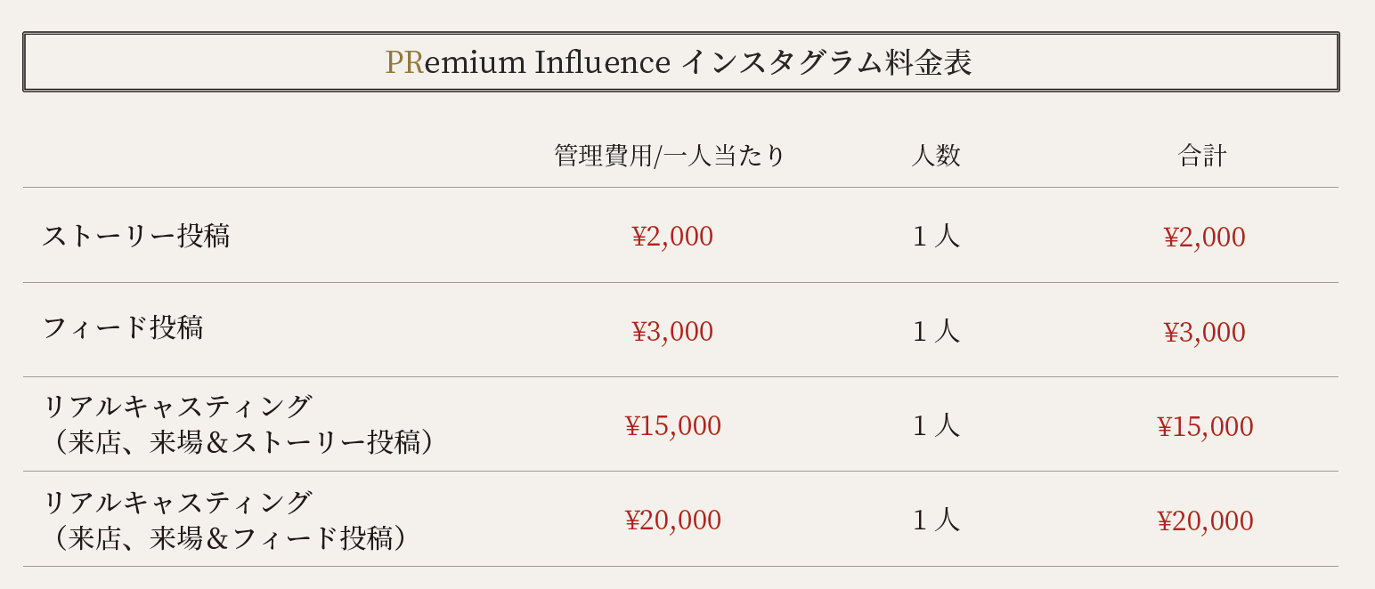 上記の料金は、弊社の管理費用(税抜)となります。別途クライアント様がご提示したインフルエンサーへの報酬にてオファー致します。オファー内容は商品提供や、クーポンや商品券付与、ギャラのお支払いなどご自由に設定可能です。オファー内容が良ければ良いほどインフルエンサーのキャスティング率はアップ致します。