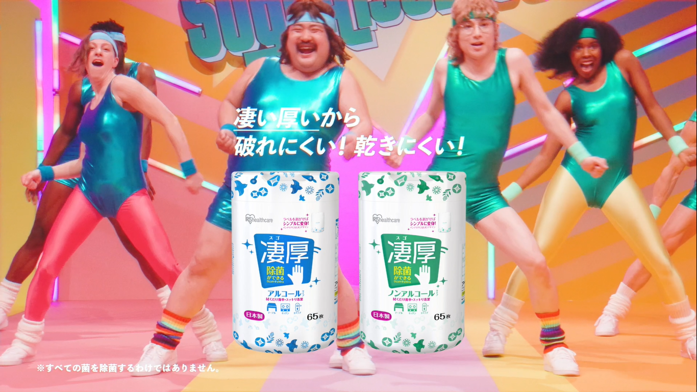 今回の新TVCM『レッツスゴアツビクス』篇は、「空気階段」の鈴木もぐらさん、水川かたまりさんがエアロビクスダンスを披露します。2人は1980年代風のレトロな音楽に合わせてステップを踏みながら、手に持った「除菌ができるウェットティッシュ 凄厚」を頭の後ろで強く伸ばしたり、両腕を上下に激しく動かしたりするなど、様々なエクササイズに挑戦します。子どもから大人まで、親しみやすいユニークなダンスと豊かな表情で、商品の特長を伝える内容になっています。