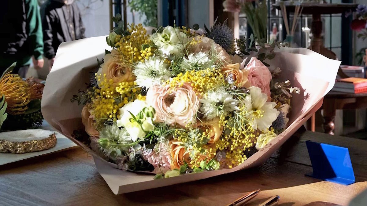 波瑠さんがその簡単さにぱっと笑みを浮かべると情景が一転、波瑠さんはモダンなフラワーショップの中に。
