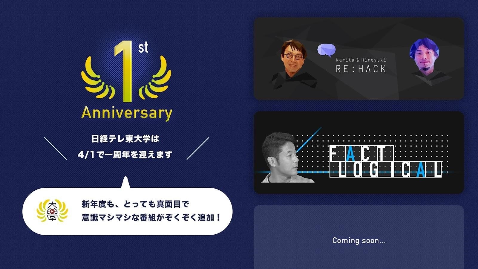 2022年4月1日(金)21時より1周年を記念した特別番組をライブ配信!日経テレ東大学チャンネルおなじみ番組プロデューサーの高橋弘樹プロデューサー(テレビ東京)がこれまでの日経テレ東大学チャンネルを視聴者の皆さんと一緒に振り返ります。