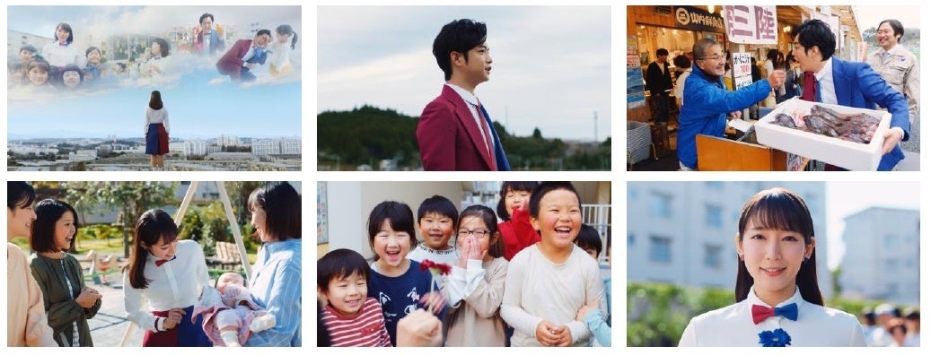 多摩ニュータウンに建ち並ぶURの団地を、高台から一望する吉岡さん。過去に紹介してきた場面を回想しながら「URはたくさんの人と人がつながる“くらし”をつくってきた」と語り、CMが始まります。すると、シーンは宮城県南三陸町の海を眺める千葉さんの後ろ姿に切り替わり、「実はそのノウハウが、この東北の地でも活かされている」と続きます。そして千葉さんは、URが復興支援に携わった東日本大震災の被災地である宮城県女川町や南三陸町、多賀城市をUR職員とともに訪問し、地域の人々と交流します。